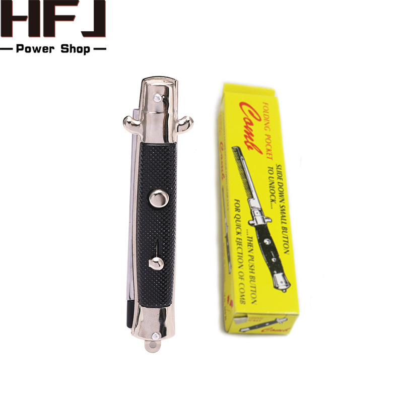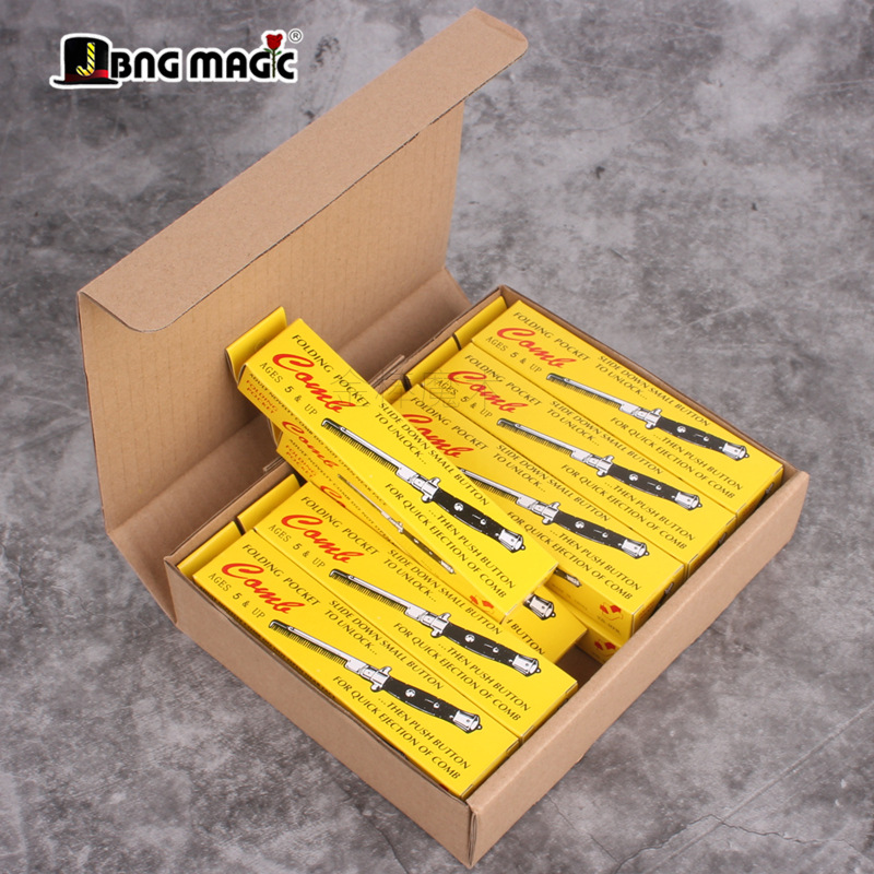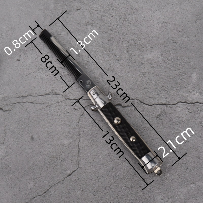 产品介绍:外壳酷似折叠叨,猛的掏出来挺吓人,按动按钮会弹出一把梳子,很是搞笑,梳子配有保险开关,打开保险后再按按钮则梳齿弹出。
