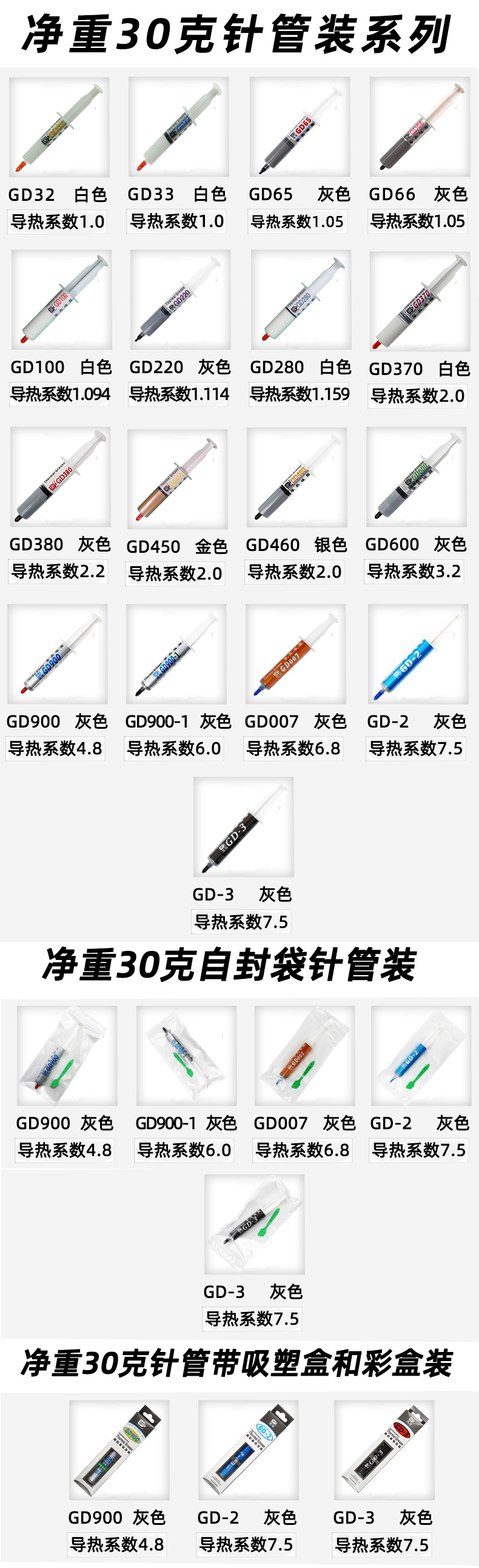 GD32-SY30 ホワイト 1.0W/M-K 正味重量 30g (針管内),GD33-SY30 ホワイト 1.0W/M-K 正味重量 30g (針管内),GD65-SY20 グレー 1.05W/M-K 正味重量 30g (針管内),GD66-SY30 グレー 1.05W/M-K 正味重量 30g (針管内),GD100-SY30 ホワイト 1.094W/M-K 正味重量 30g (針管内),GD220-SY30 グレー 1.114W/M-K 正味重量 30g (針管内),GD280-SY30 ホワイト 1.159W/M-K 正味重量 30g (針管内),GD370-SY30 ホワイト 2.0W/M-K 正味重量 30g (針管内),GD380-SY30 グレー 2.2W/M-K 正味重量 30g (針管内),GD450-SY30 ゴールド 2.0W/M-K 正味重量 30g (針管内),GD460-SY30 シルバー 2.0W/M-K 正味重量 30g (針管内),GD600-SY30 グレー 3.2W/M-K 正味重量 30g (針管内),GD900-SY30 グレー 4.8W/M-K 正味重量 30g (針管内),GD900-BA30 グレー 4.8W/M-K 正味重量 30g ジップロックバッグシリンジ,GD900-BX30 グレー 4.8W/M-K 正味重量 30g カラーボックス針管,GD900-1-SY30 グレー 6.0W/M-K 正味重量 30g (針管内),GD900-1-BA30 グレー 6.0W/M-K 正味重量 30g ジップロックバッグシリンジ,GD007-SY30 グレー 6.8W/M-K 正味重量 30g (針管内),GD007-BA30 グレー 6.8W/M-K 正味重量 30g ジップロックバッグシリンジ,GD-2-SY30 グレー 7.5W/M-K 正味重量 30g (針管内),GD-2-BA30 グレー 7.5W/M-K 正味重量 30g ジップロックバッグシリンジ,GD-2-BX30 グレー 7.5W/M-K 正味重量 30g カラーボックス針管,GD-3-SY30 グレー 7.5 W/M-K 正味重量 30 グラム (針管内),GD-3-BA30 グレー 7.5 W/M-K 正味重量 30g ジップロックバッグシリンジ,GD-3-BX30 グレー 7.5 W/M-K 正味重量 30g 針管、ブリスターボックスとカラーボックス付き