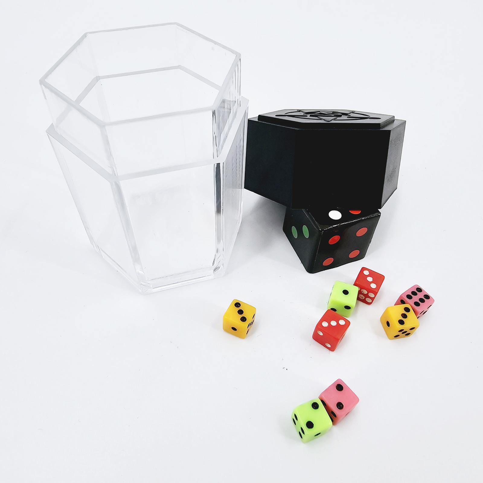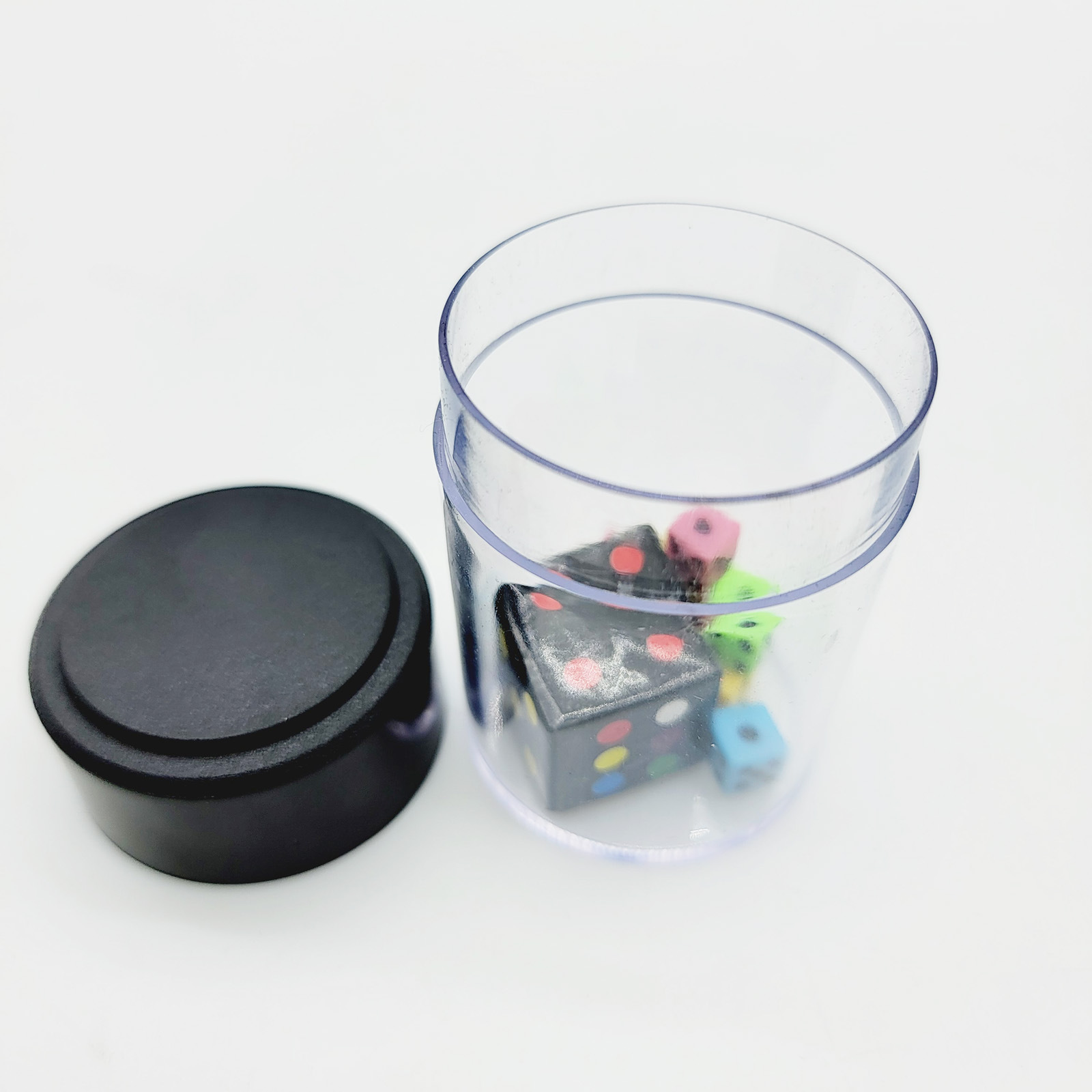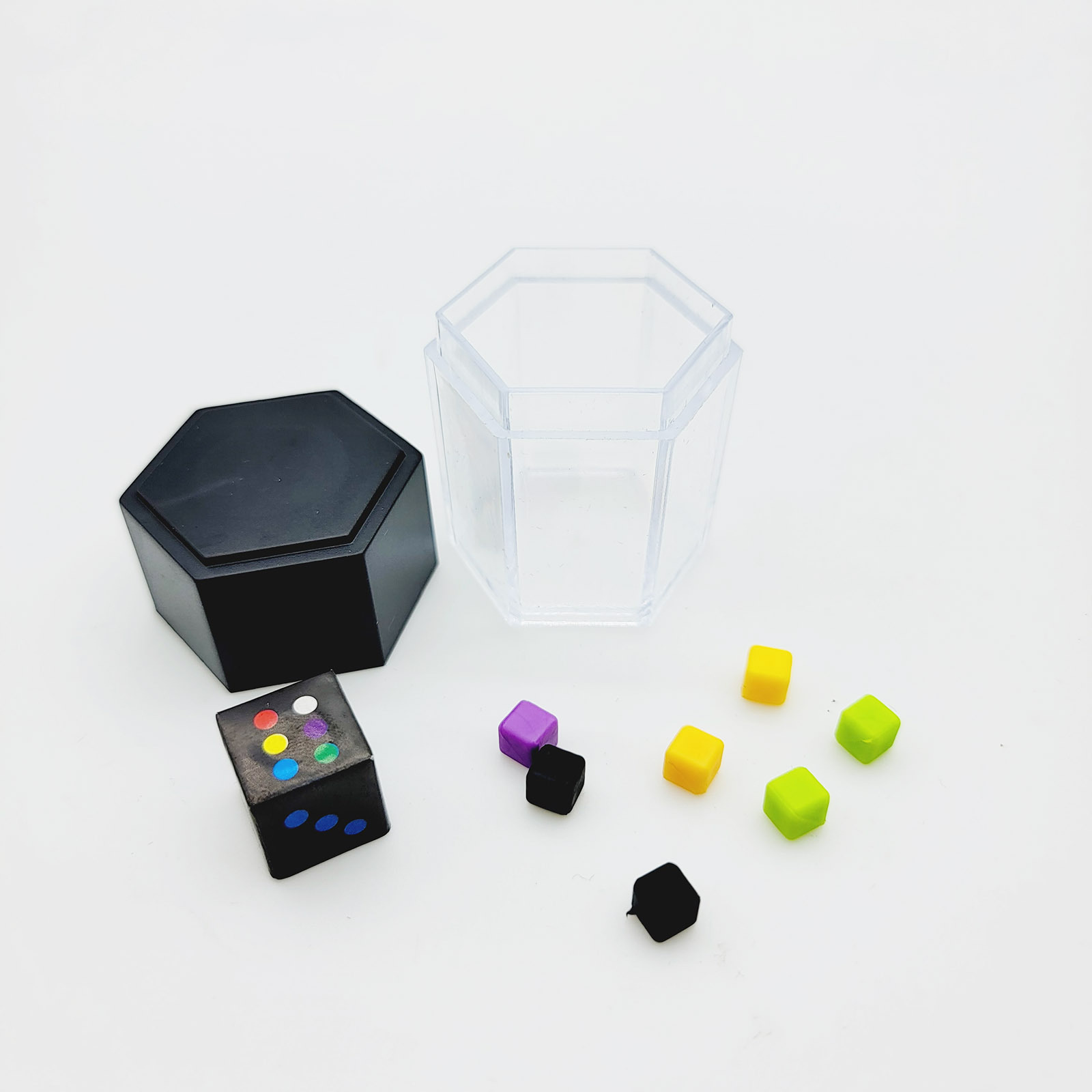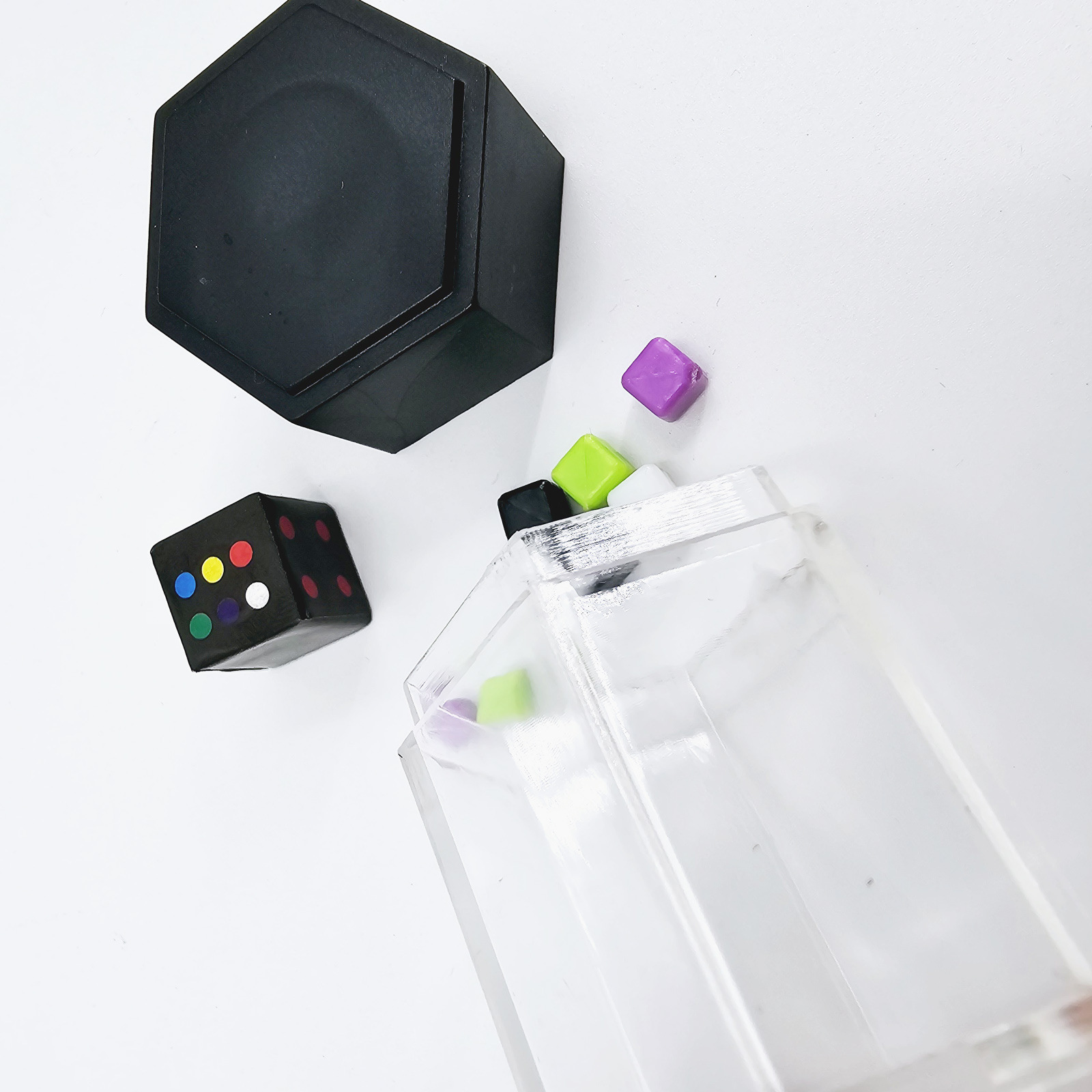 一颗普通的黑色大骰子放在透明盒中,魔术师一摇透明盒,大骰子瞬间变成了8颗小的白色骰子,神奇惊人,此道具可交于观众检查。一颗大骰子放在透明盒中,魔术一摇透明盒,大骰子瞬间变成了很多小骰子,非常神奇,此道具完全可以交给观众检查。