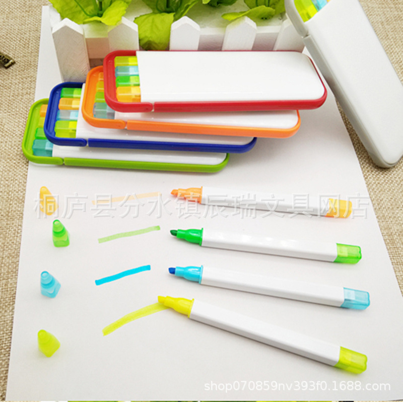 为了更好的方便大家 收纳盒里面可以全部是荧光笔,如图左边是常规的3+1+1,右边是5支不同色的荧光笔,提供了选择空间