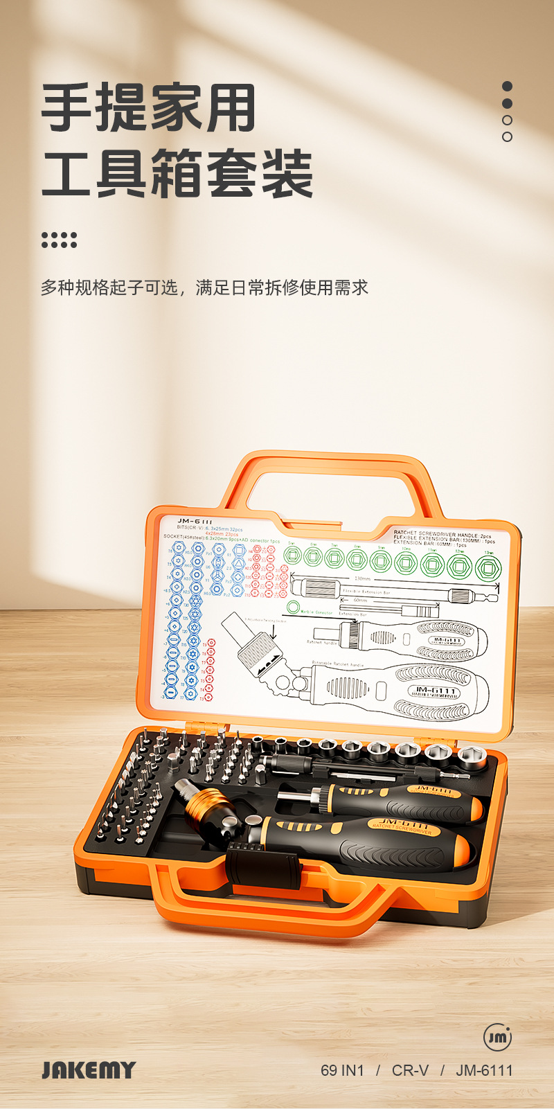 69ピース家庭用クロススリーブユニバーサルラチェットドライバーセット多机能修理ツールJM-6111