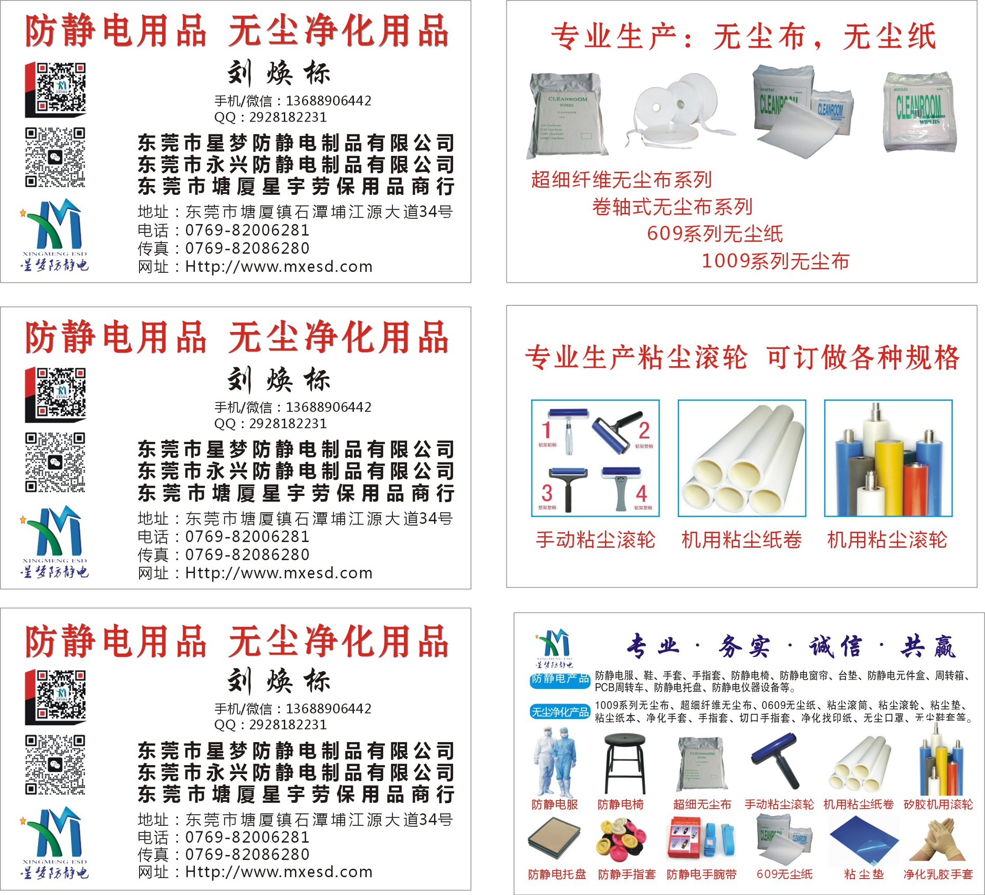东莞市永兴防静电制品有限公司成立于2005年 东莞市塘厦星宇劳保成立于2010年,东莞市星梦防静电制品有限公司成立于2015年,三家公司同属一个体系。是专注于防静电产品生产的企业。公司位于广东省东莞市,拥有先进的生产设备和技术力量,产品主要包括:无尘纸,无尘布,粘尘滚轮,硅胶滚轮,机用除尘胶辊,静电滚轮,粘尘纸卷 粘尘垫 防静电台面垫,防静电手指套,防静电手腕带,防静电椅,防静电凳子,防静电工作服、防静电大褂、防静电鞋、防静电手套等。公司产品广泛应用于电子、半导体、医药、生物工程、石油化工等行业,为客户提供的防静电解决方案。