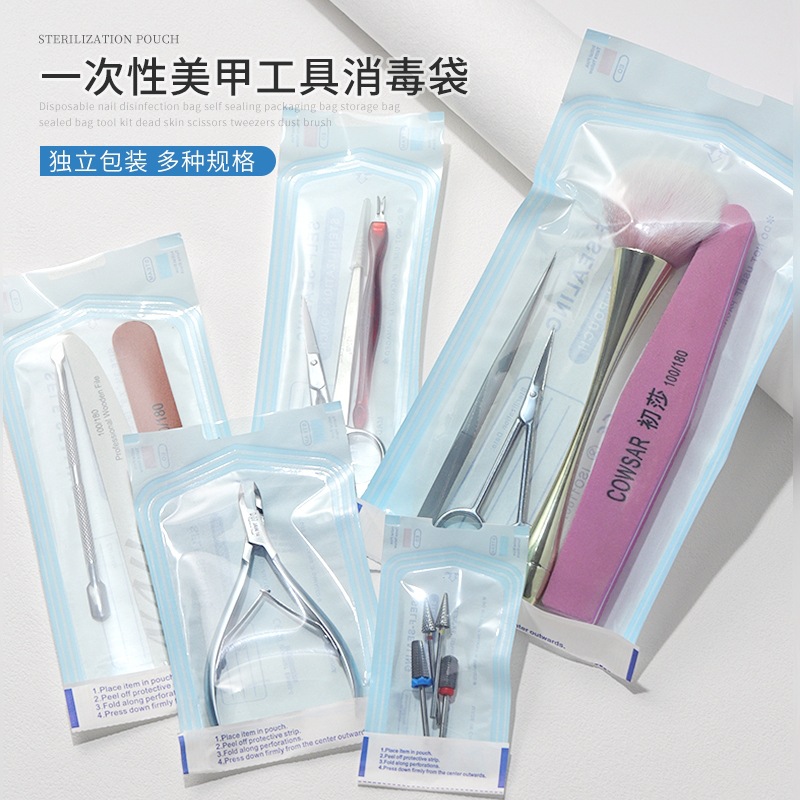 使い捨て滅菌袋、マニキュアツール、角質はさみ、スチールプッシャー、研磨ヘッド、滅菌袋、保管包装、ジップロックバッグ