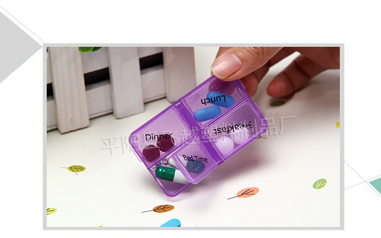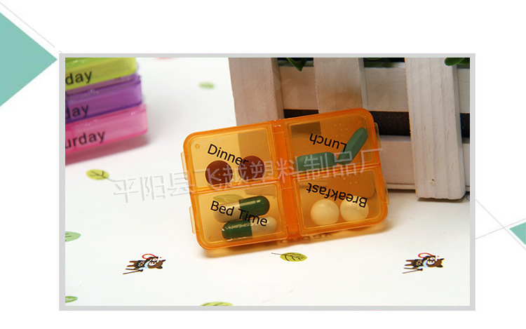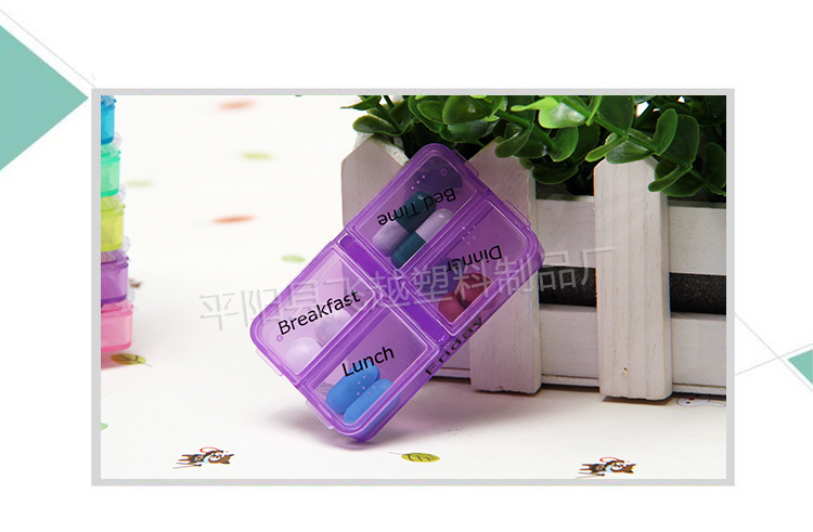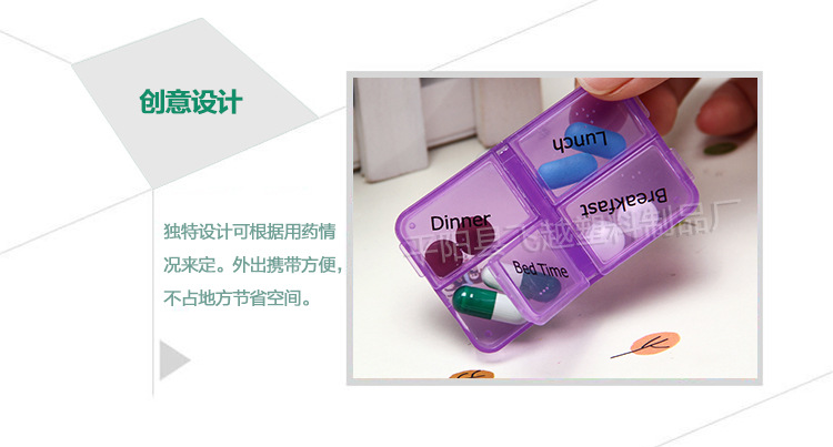 | 普通分药盒即口语中常提到的药盒。塑料药盒拥有一个或多个药格,方便服药者把要吃的药按剂量放入药格中存储,以便于携带及按时吃药。一般以食品级以上的塑料制作,主要材质为PP或ABS。普通分药盒的形式一般有圆形、碟形、长条形、方形。由储药次数的多寡又可分为便携式、家用式。便携式以方便携带为主,体积小巧,追求造型的美观。家用型以满足多次或多人服药为主,一般可以储存一周或一月的药量。 现在繁忙的事务、迅速的变化和激烈的竞争使越来越多的现代人因为缺乏这样那样的元素而形成“亚健康”状态。于是你们需要一个可以随时随身携带的塑料药盒,帮助的按时吃药。很多年轻白领,每天随身携带药盒,里面除了各类营养药就是常用OTC药,追求健康成为了一种时尚和新的生活方式。 |