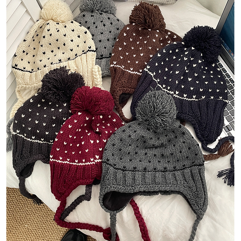 韩系可爱毛球帽秋冬内里加厚保暖系带护耳帽休闲百搭针织套头帽子