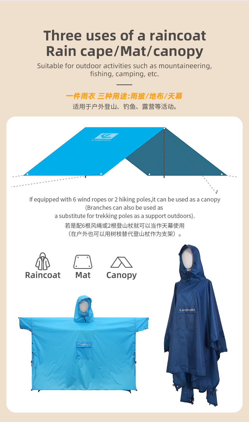 ロングシンガー ロンシンガー アウトドア レインポンチョ 登山 旅行 3in1 キャンプ サイクリング ハイキング レインポンチョ レインコート 卸売