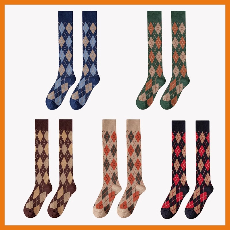 春秋の和風レトロ菱形柄ふくらはぎ丈ソックス、インスタ映えするハイソックス、イギリス風カレッジスタイルソックス、女性用菱形格子柄ソックス
