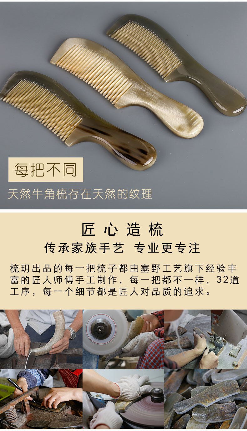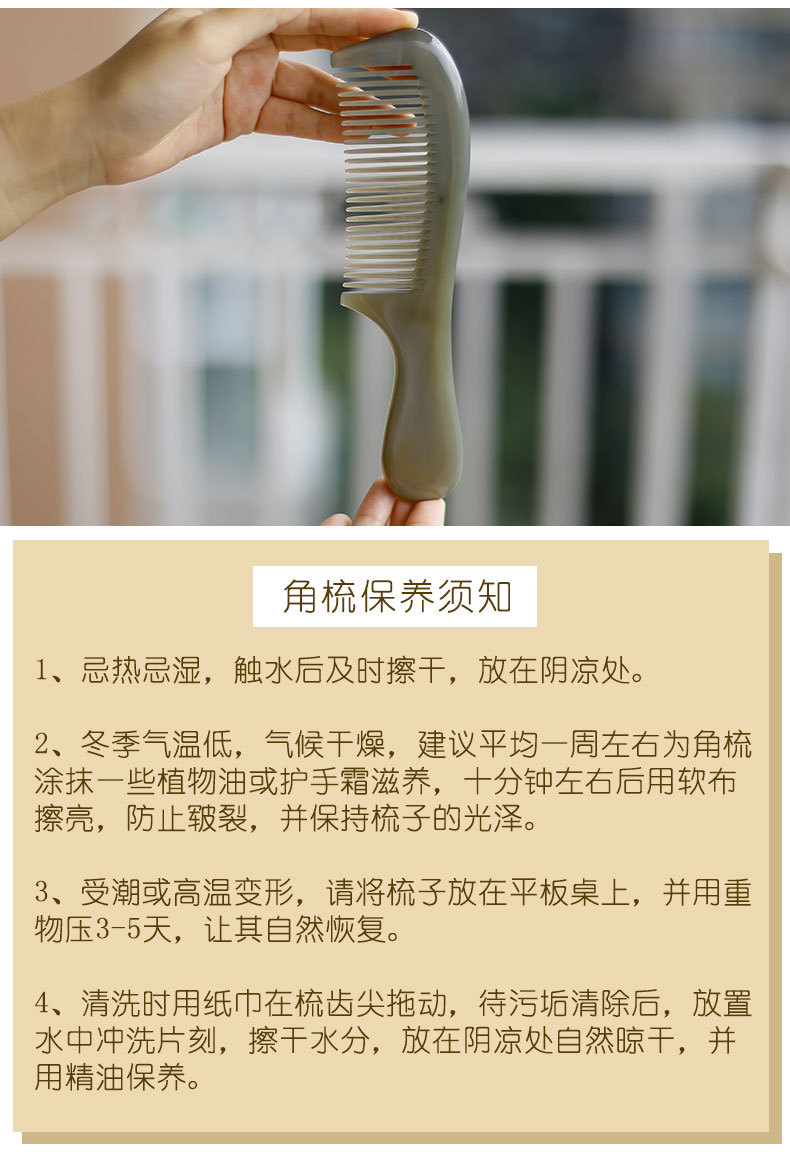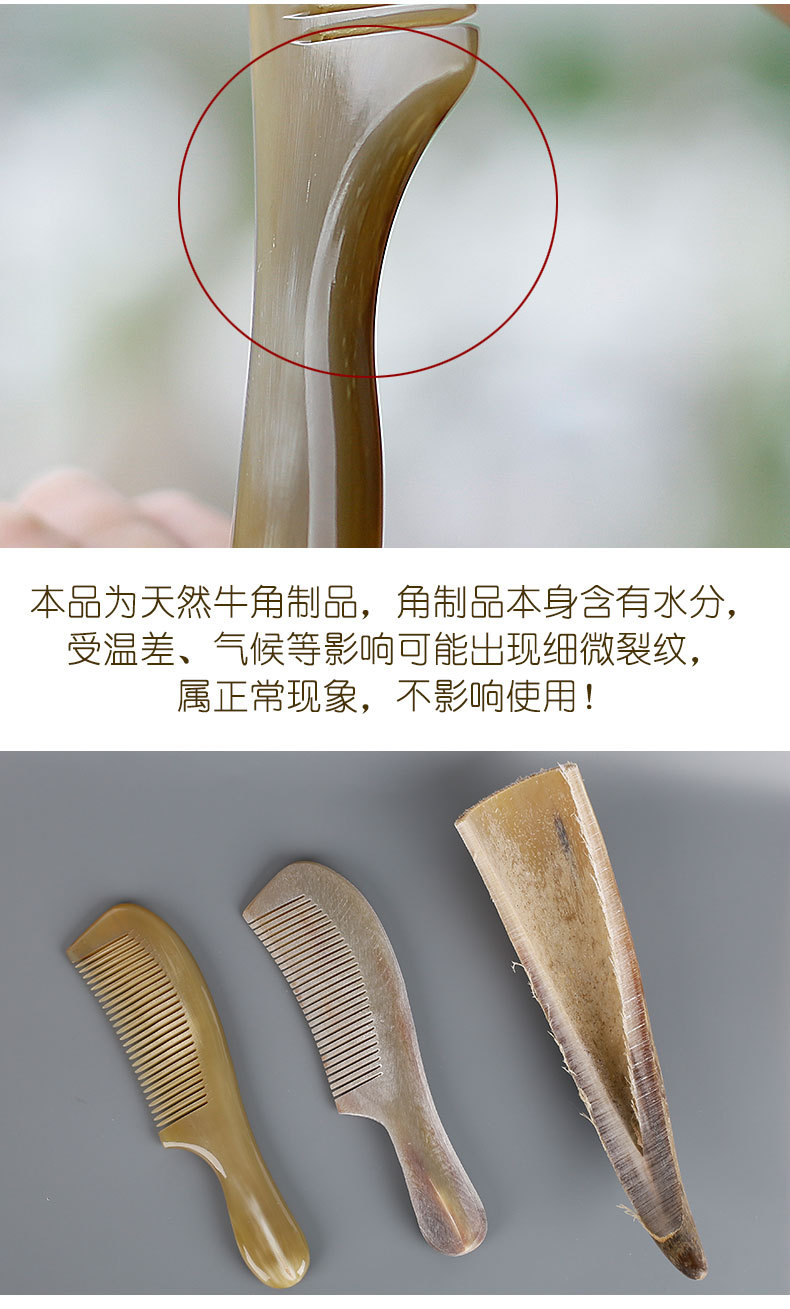 产品介绍:这款梳子选用优质天然牦牛角梳制作,需经过切片、成形、开齿、打磨、抛光等25余道工序制作而成
