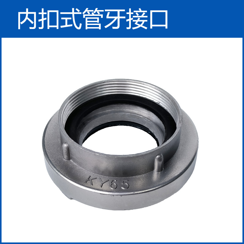 消防接口型式有:内扣式接口、快速接口、管牙接口、内螺纹固定接口、外螺纹固定接口、闷盖、异径接口等。用于水带与水带之间、消防栓、水枪、分水器、集水器等装备进、出口处、用于输送水、水和泡沫混合液。