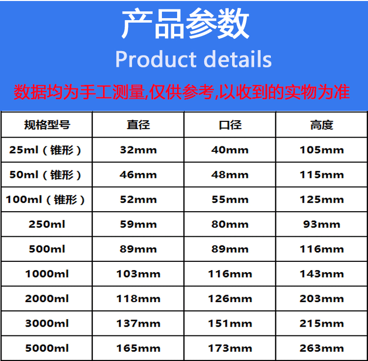 容量 25mL(円錐形),50ml(円錐形),100ml(円錐形),250ml,500ml,1000mL,2000ML,3000ml,5000ml