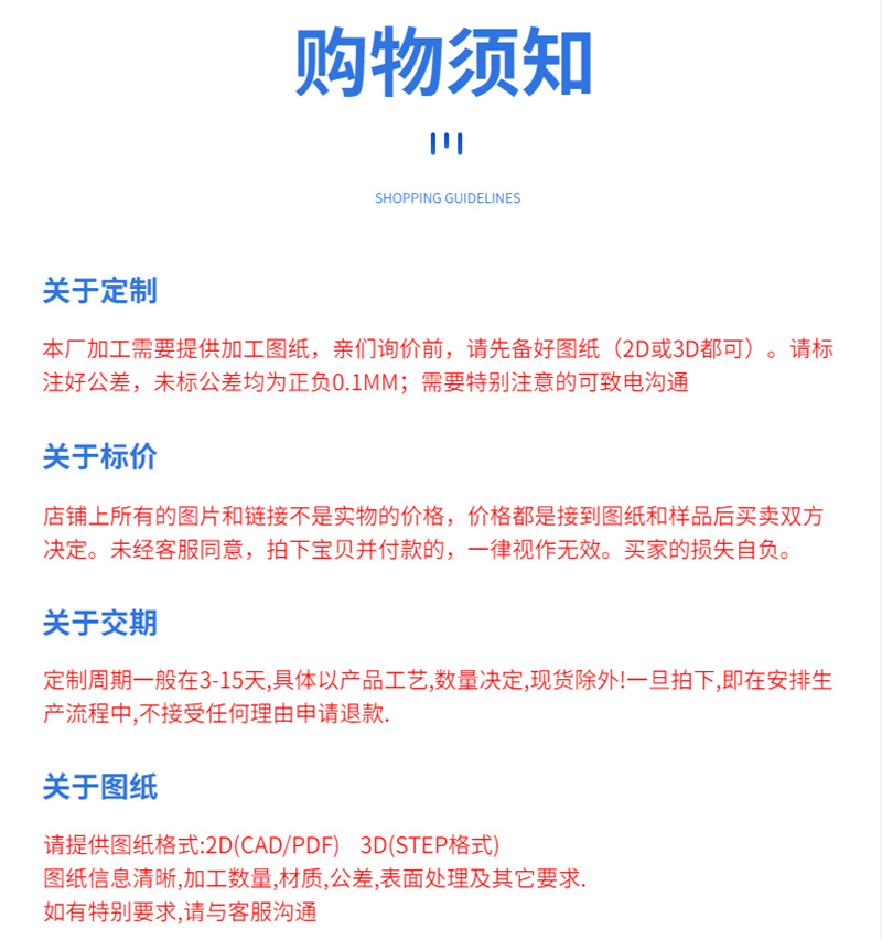 1.本厂加工需要提供加工图纸,亲们询价前,请先备好图纸(2D或3D都可)。请标注好公差,未标公差均为正负0.1MM;需要特别注意的可致电沟通. 2.店铺上所有的图片和链接不是实物的价格,价格都是接到图纸和样品后买卖双方决定。未经客服同意,拍下宝贝并付款的,一律视作无效。买家的损失自负。