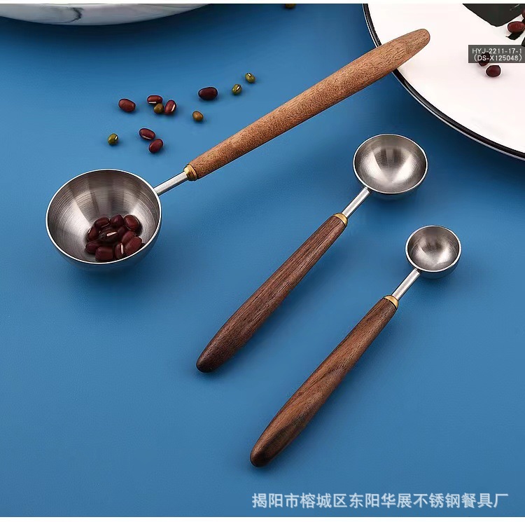 メーカー卸売り焙煎用具計量スプーン計量カップステンレス304胡桃木柄大中トランペット計量スプーン