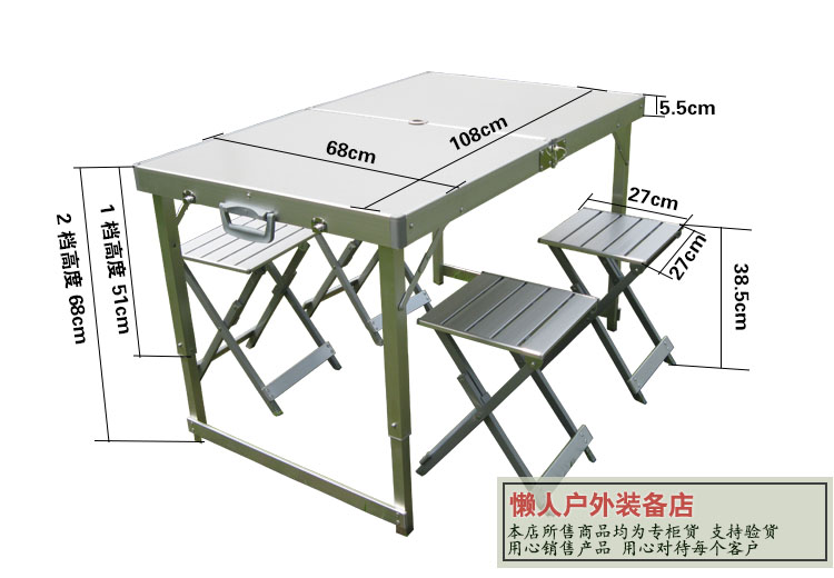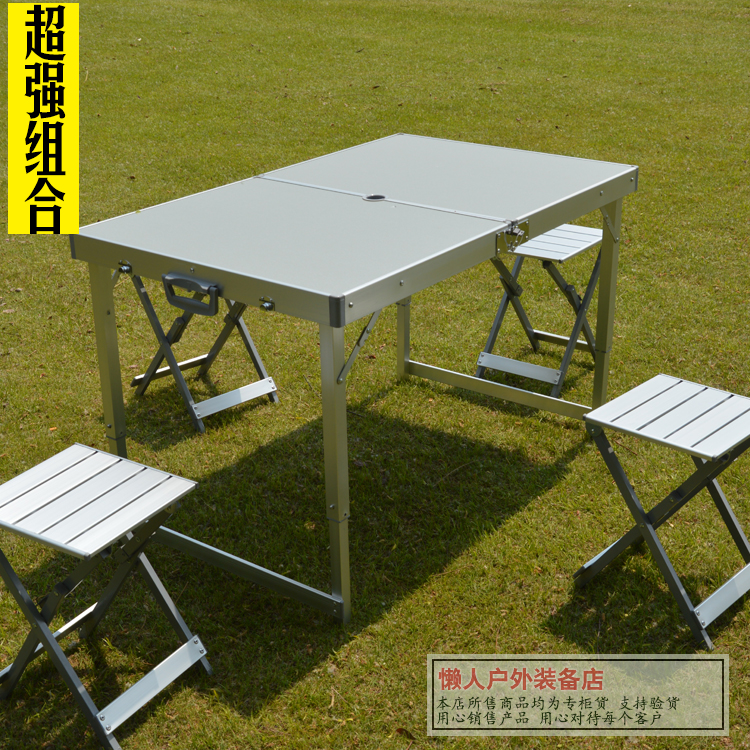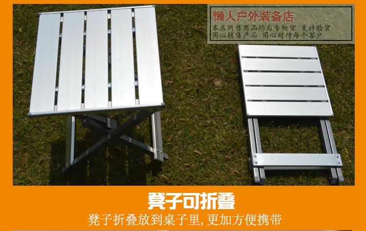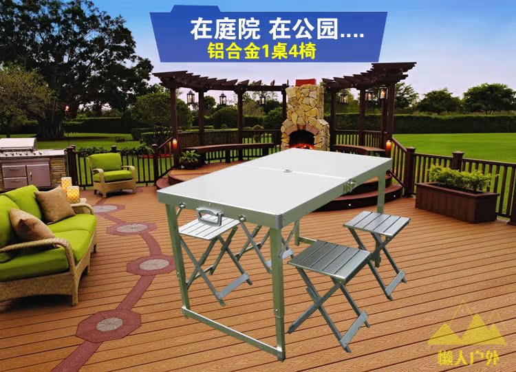 为了能方便户外使用,四把凳子可以收放到桌子肚子里面。因为是全铝合金做的,所以看上去比较稳重,大方。我们公司人员也常常坐在上面吃饭什么的。价格已经很低了。如果要单单椅子,一把是40块钱一把。质量相当不错的。我们可以保证质量~