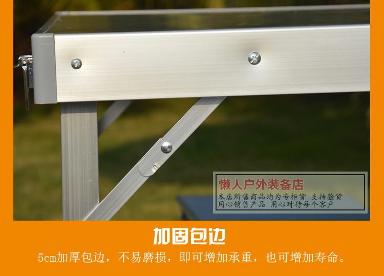 亲,网上现在很多的都是桌面为铝塑板,桌身是铝合金注铁的(可以吸住磁铁的),重约14公斤多。比较的不结实。而我们桌椅的净重只有11.2公斤,桌面是加密防火板,桌身为全铝合金。以下的实拍图您就可以理解了。