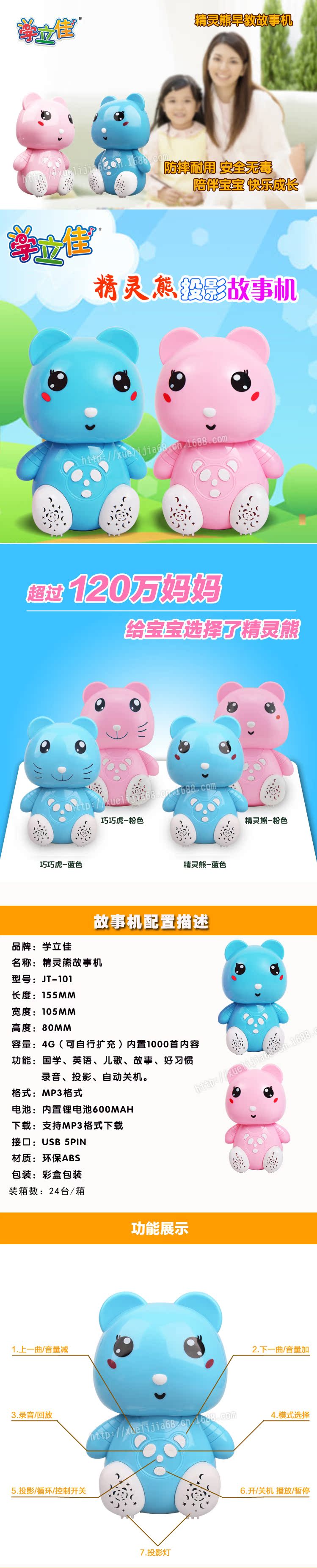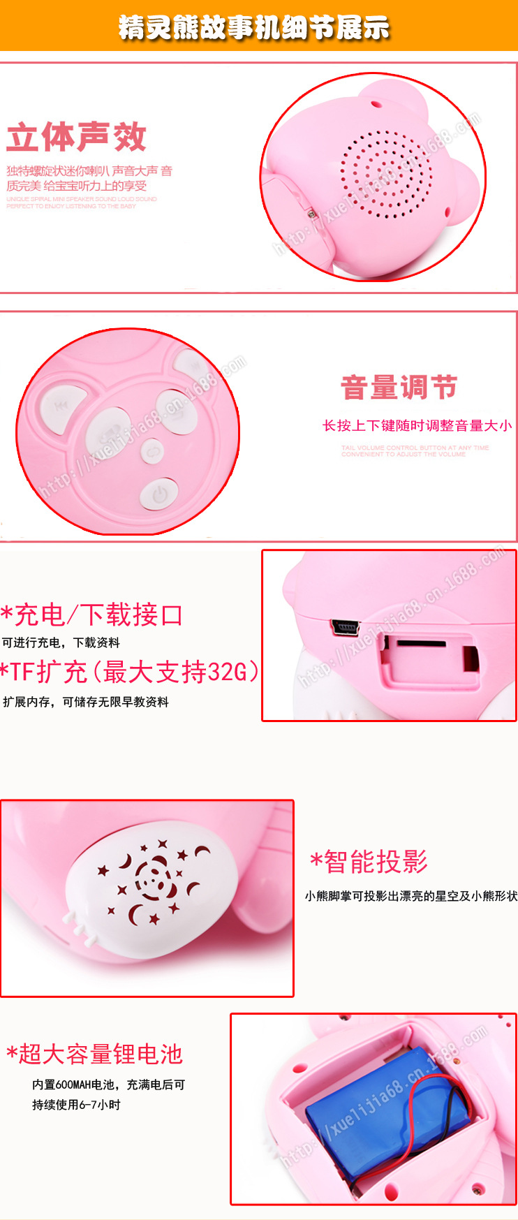 亲们!精灵熊故事机超级优惠活动开始啦,详情请咨询电话13902481019钟小姐,内置4G容量880首精点早教资源(国学、故事、儿歌、英语、好习惯),可自行扩充故事机内存进行下载,只要MP3格式均可识别,不限任何网站,最大支持扩充内存卡32G,可无限下载早教资源,录音,智能投影,摇控选台,音质效果好,质量有保证,免费保修1年!