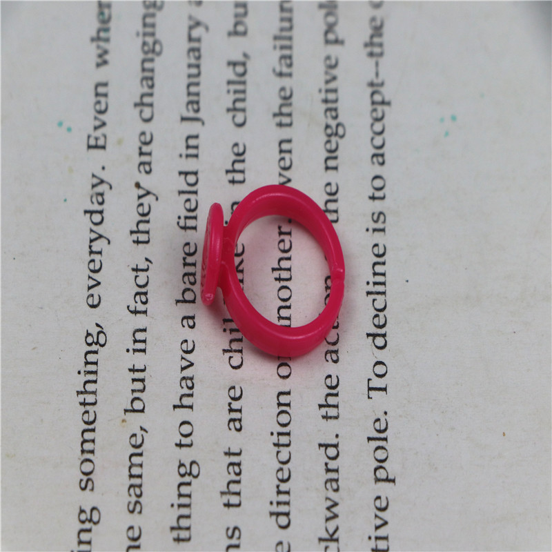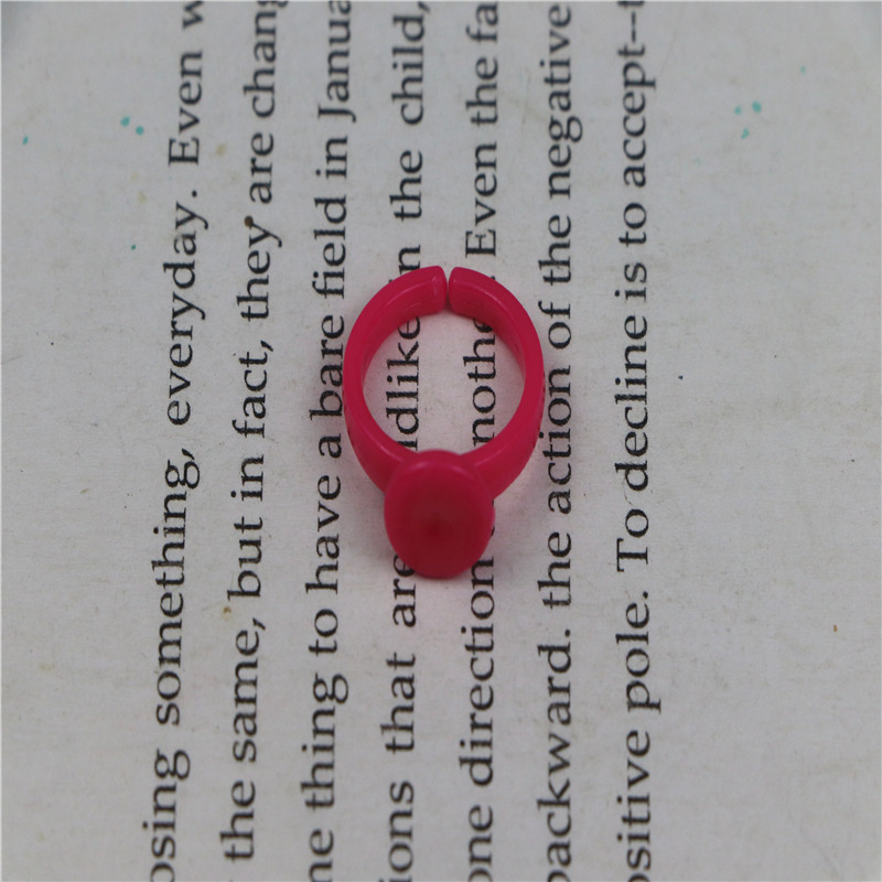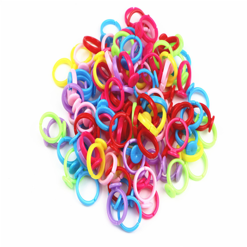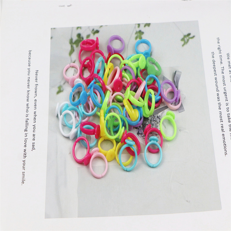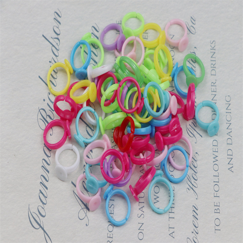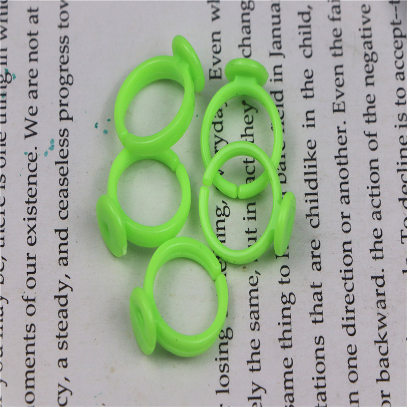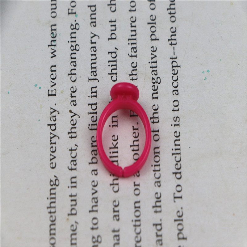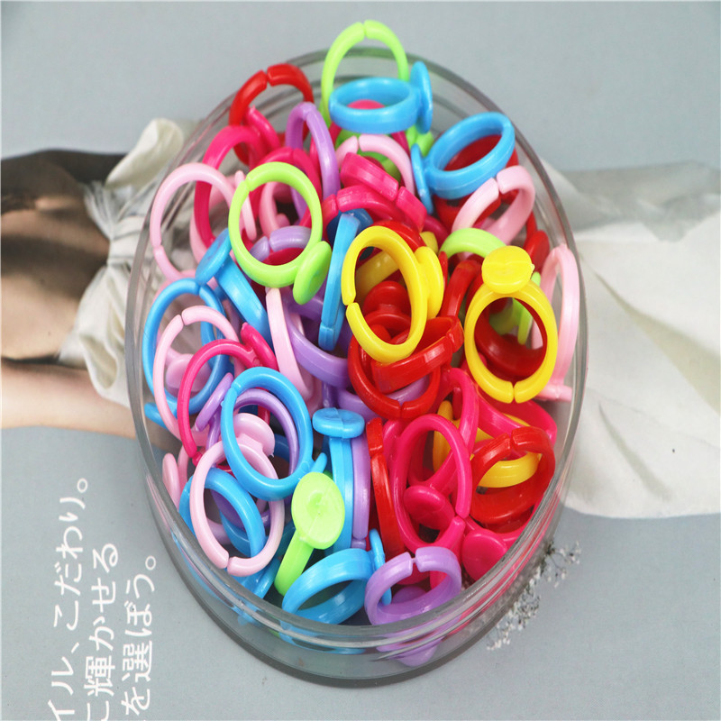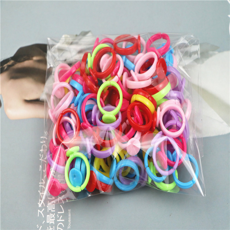 畅销儿童塑料戒指圈,内径是1.4厘米,外径1.7厘米 托盘直径1厘米,10个颜色,可单色买,也可混色买。其他还有合金的.款式多,量大可以定做加工。
