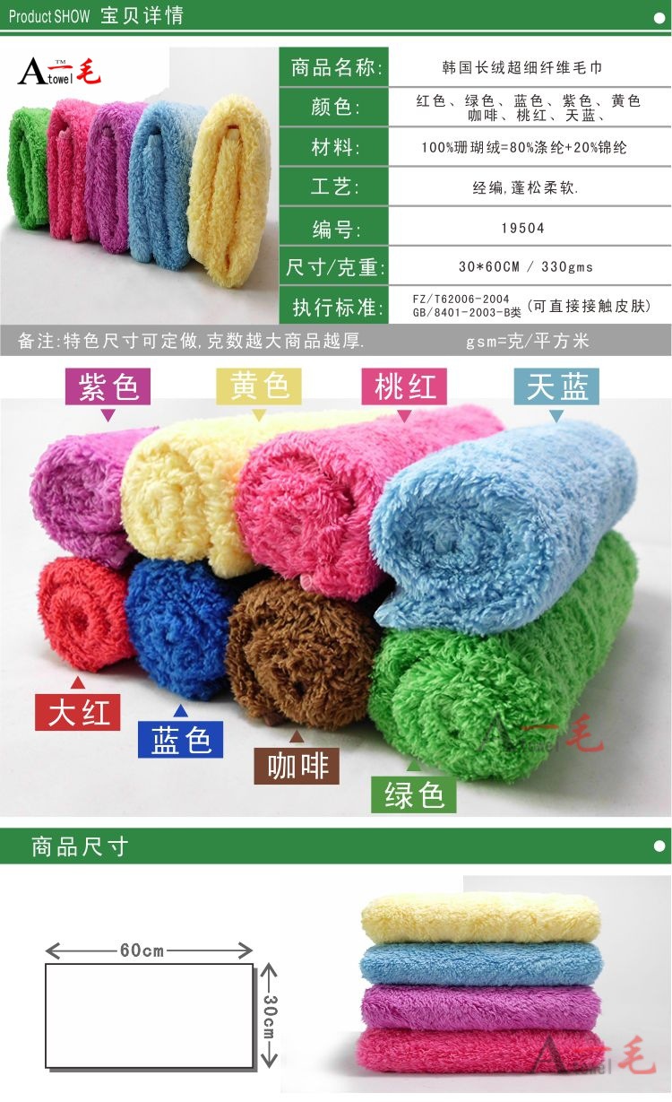 五、易清洗:普通毛巾使用时,特别是天然纤维毛巾,将被擦物表面的灰尘、油脂、污垢等直接吸收到纤维内部,使用后残留于纤维之中,不易清除,用了较长时间后甚至会变硬失去弹性,影响使用。而超细纤维毛巾是把污物吸附于纤维之间(而不是纤维内部),再加之纤维纤度高、密度大,因此吸附能力强,使用后只需用清水或稍加洗涤剂清洗即可。