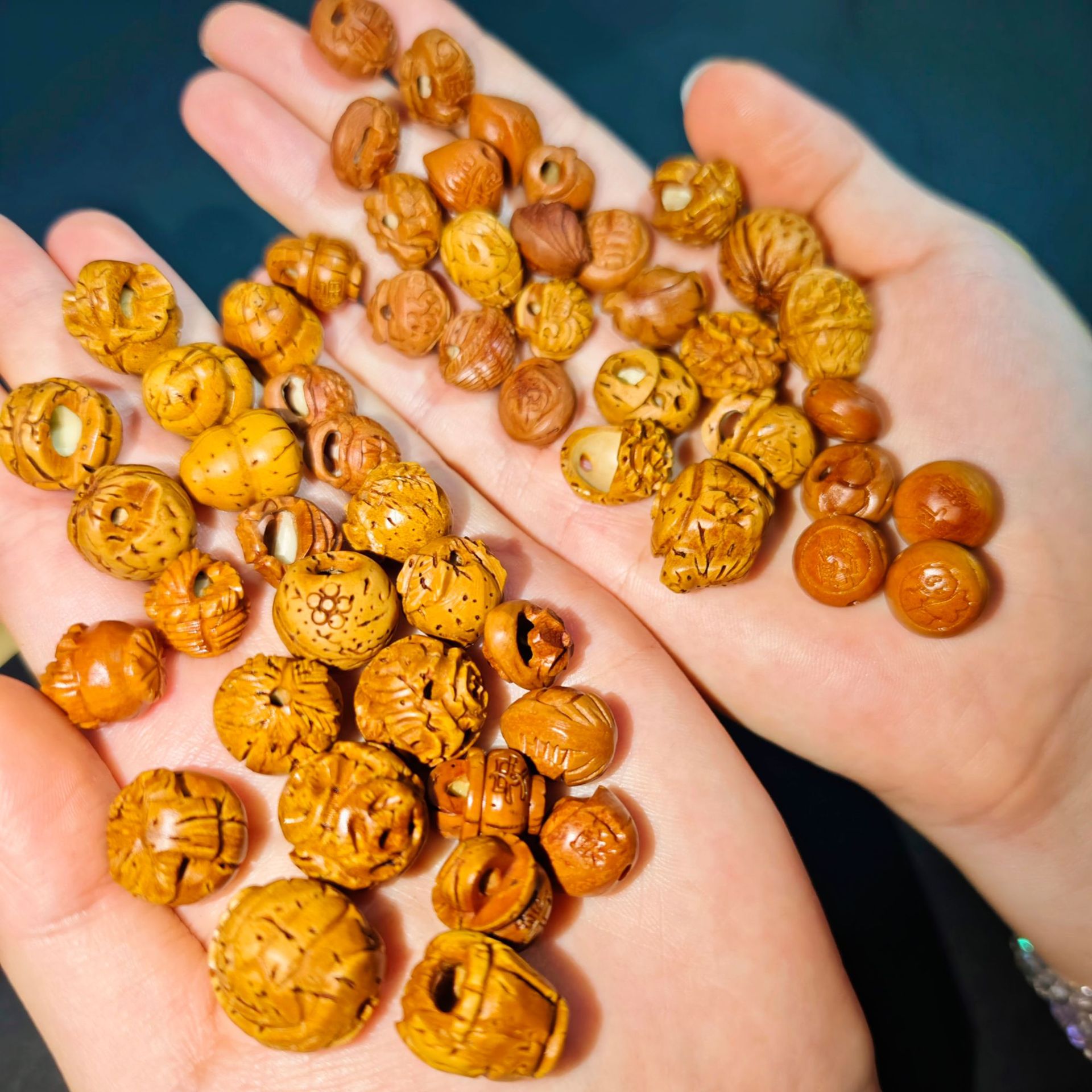 野生桃核原料,纯手工雕刻,尺寸每批次大小不一,个别存在裂缝的,桃核雕刻难免的,不能接受的慎拍。桃核没有上漆,上了橄榄油,防开裂。我们家做工精细,打磨光滑,量大需要制作周期。