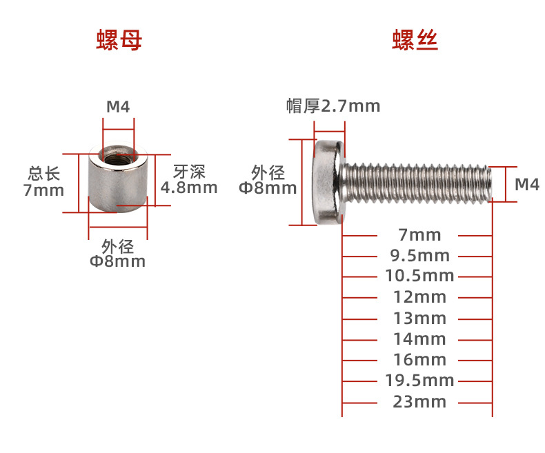 製品仕様 8*2.7,m4*7+8*7,8*2.7,m4*9.5+8*7,8*2.7,m4*10.5+8*7,8*2.7,M4*12+8*7,8*2.7,M4*13+8*7,8*2.7,m4*14+8*7,8*2.7,m4*16+8*7,8*2.7,m4*19.5+8*7,8*2.7,M4*23+8*7