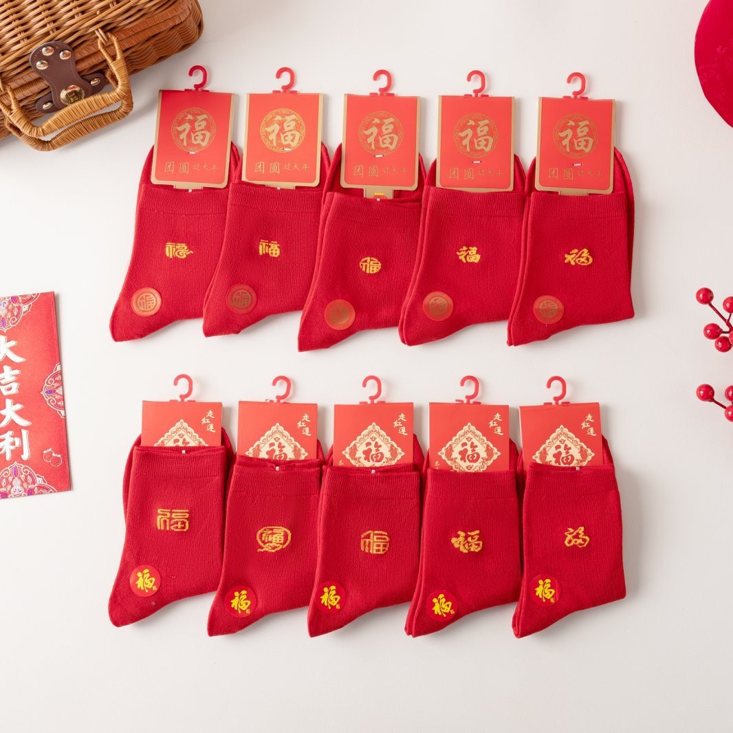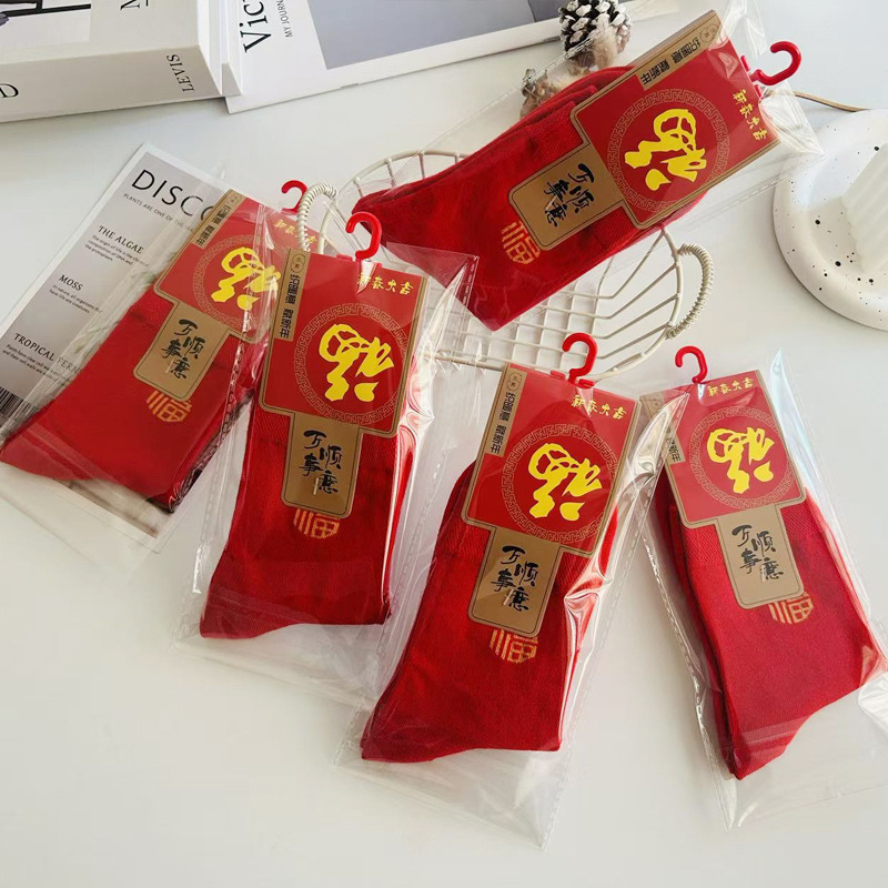 独立包秋冬款新年大红福字袜中筒本命年男女鸿运袜摆地摊袜子批发