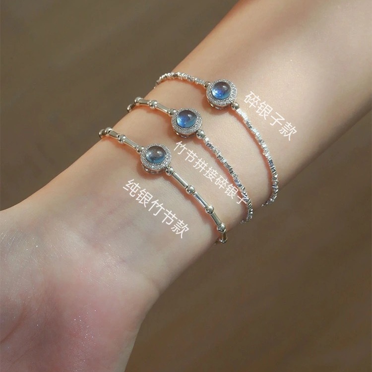 S925純銀の軽豪華なダイヤモンドの天然海藍宝の砕銀のブレスレットの女性の甘い気質の小さい大衆の風の銀の竹節の手の装飾