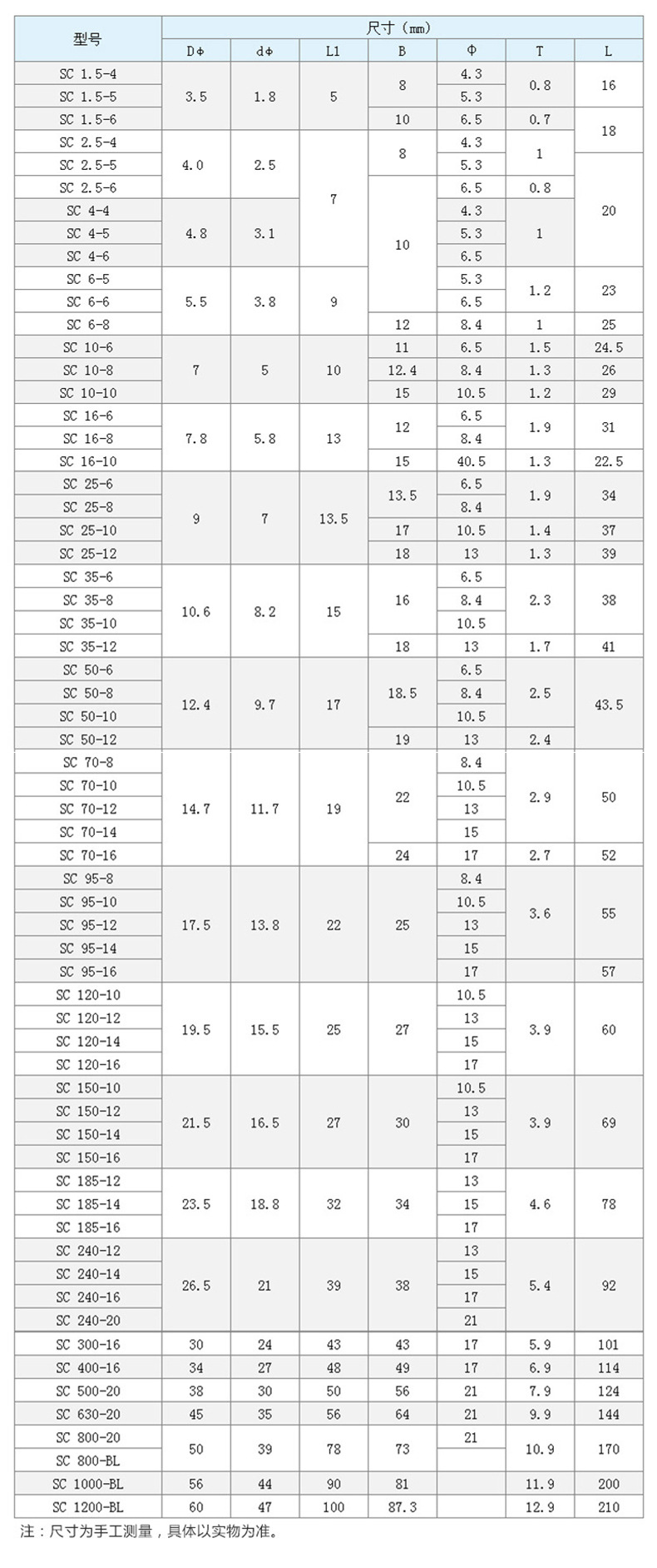 型番 SC1.5-4,SC1.5-5,SC1.5-6,SC2.5-4,SC2.5-5,SC2.5-6,SC4-5,SC4-6,SC4-8,SC6-5,SC6-6,SC6-8,SC10-6,SC10-8,SC10-10,SC10-12,SC16-6,SC16-8,SC16-10,SC16-12,SC-25,SC-35,SC-50,SC-70,SC-95,SC-120,SC-150,SC-185,SC-240,SC-300,SC-400,SC-500,SC-600