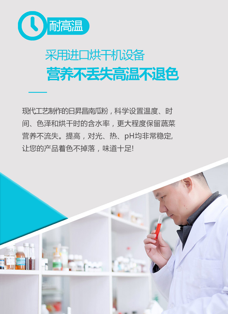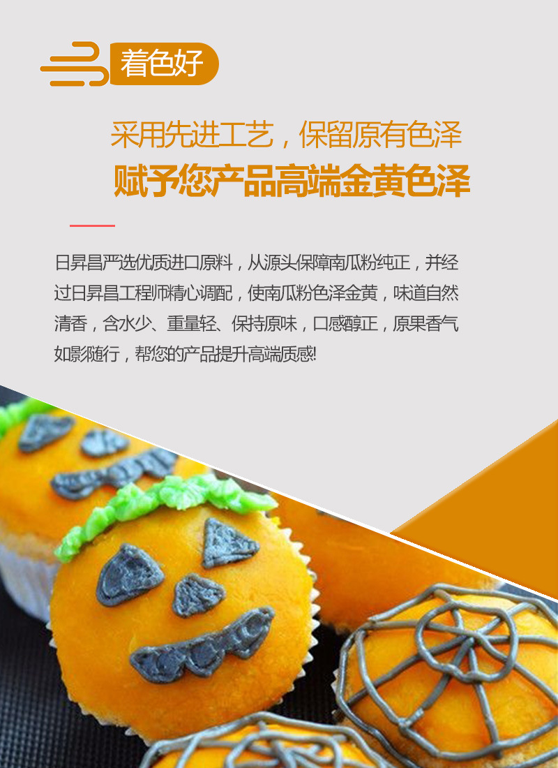 南瓜粉不仅颜色金黄,入口有鲜南瓜清爽感觉,易溶于水,其目数在100--120目之间可调,不含任何添加剂、防腐剂和色素,以及不搀加从颜色和口味上相似或类似的物质。