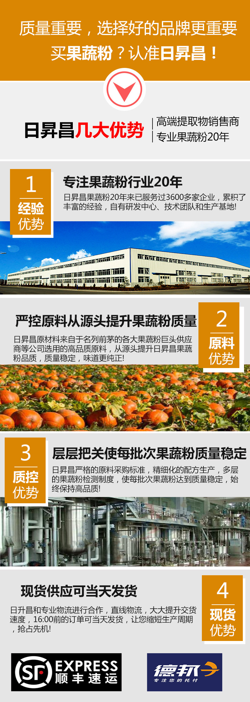青岛日昇昌食品配料有限公司常年现货供应各种果蔬五谷粉:脱水南瓜粉,烘干南瓜粉,冻干南瓜粉,喷雾干燥南瓜粉,紫薯粉大蒜粉,番茄调味粉,木瓜粉等众多产品,目数规格可根据您的需求定制。