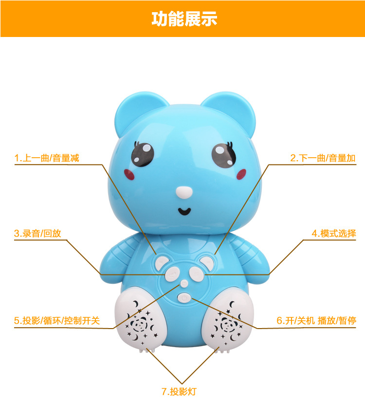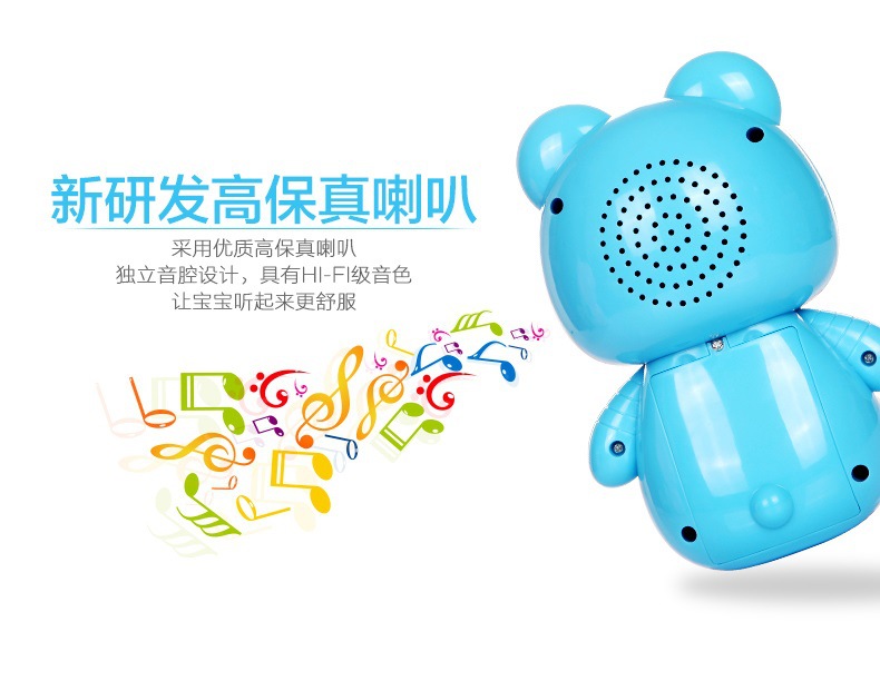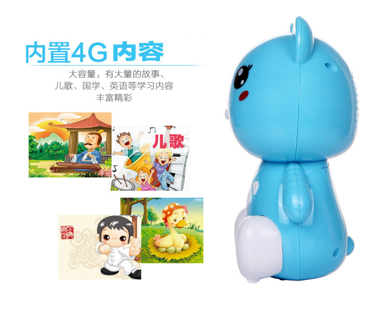 亲们!精灵熊故事机超级优惠活动开始啦,内置4G容量880首精点早教资源(国学、故事、儿歌、英语、好习惯),可自行扩充故事机内存进行下载,只要MP3格式均可识别,不限任何网站,最大支持扩充内存卡32G,可下载早教资源,录音,智能投影,摇控选台,音质效果好,质量有保证,免费保修1年!