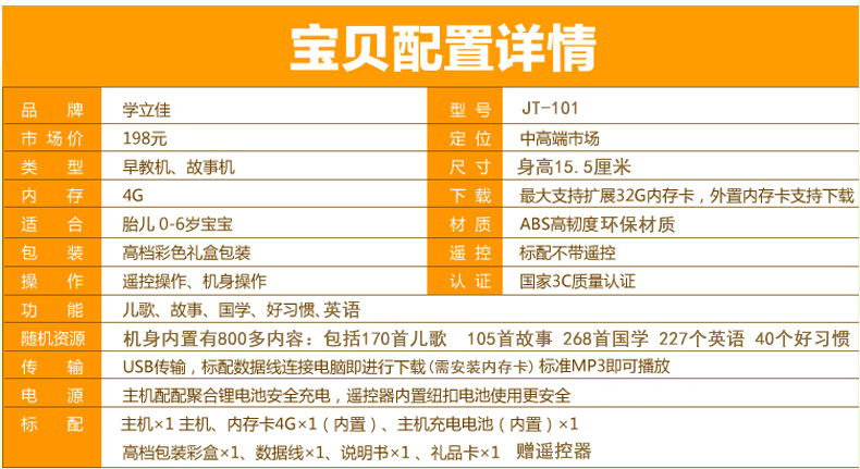 故事机1个+摇控器1个+充电线1条+说明书保修卡1本+祝福贺卡1张+精美包装盒1个