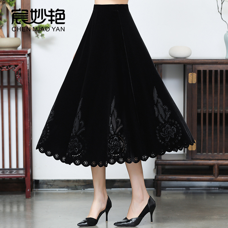 2025 春と秋の新作マザーズゴールドベルベットドレス中高年女性のミドル丈スカート卸売代理店