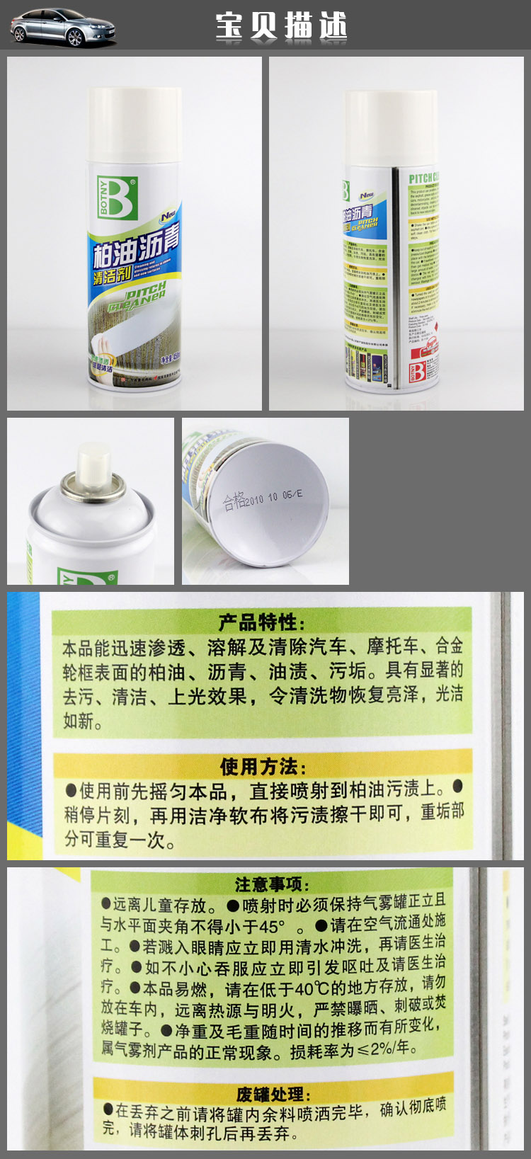 ●本品能迅速渗透、溶解及清除汽车、摩托车、合金轮框表面的柏油、沥青、油渍、污垢。具有显著的去污、清洁、上光效果,令清洗物恢复亮泽,光洁如新。