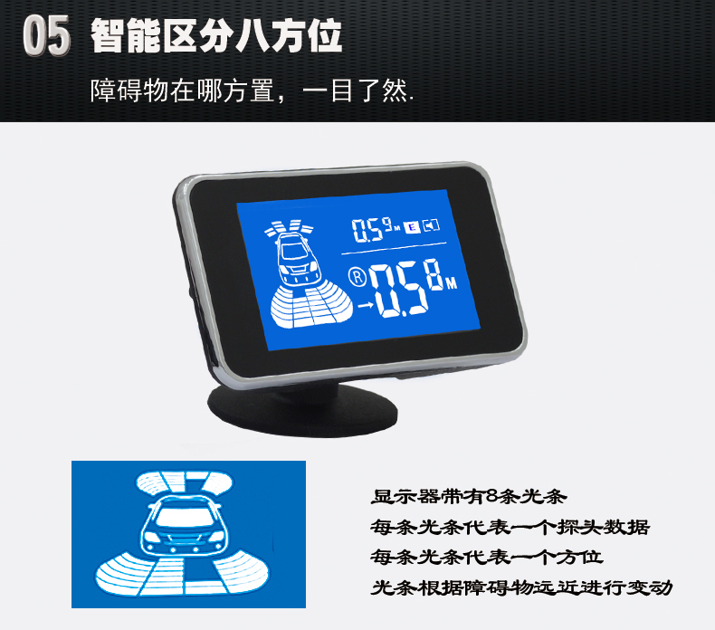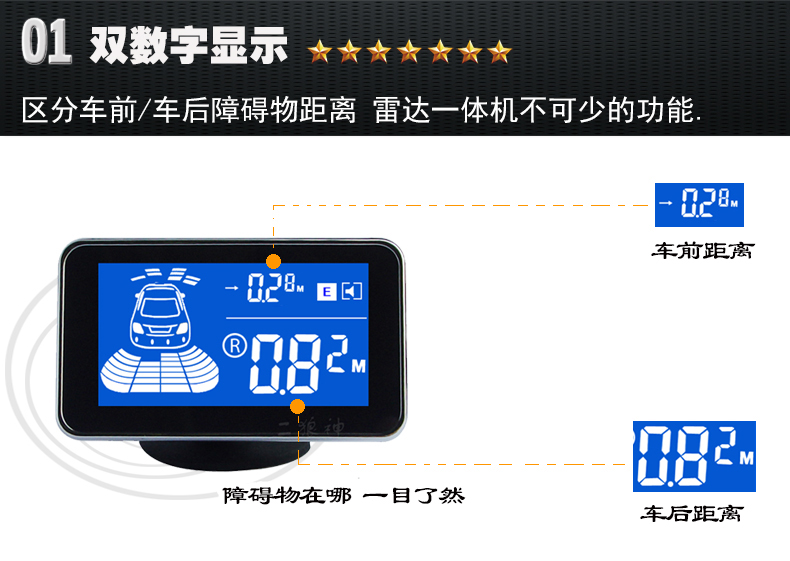 ◆数字提示:数字光条显示障碍物的距离和方位,一目了然