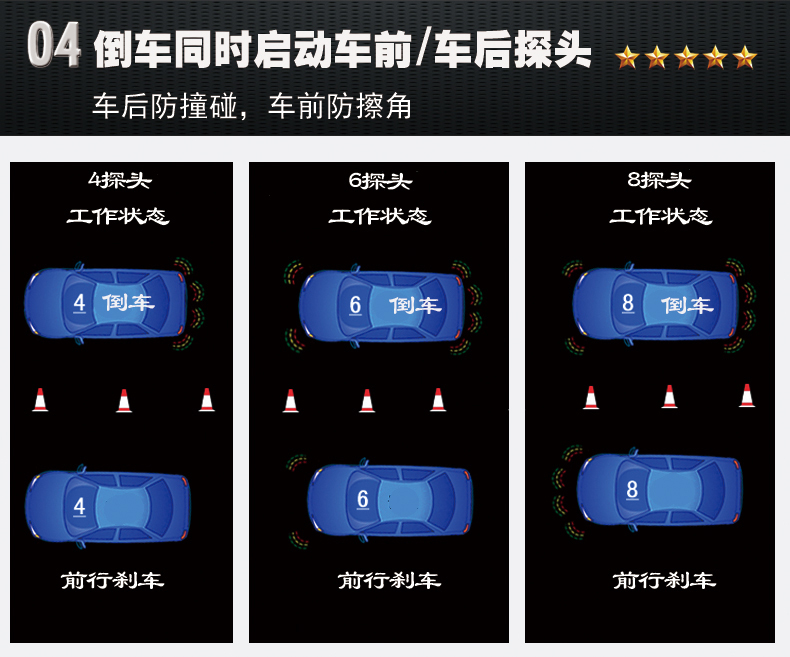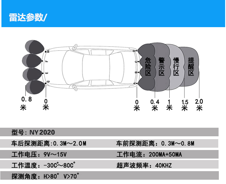 ◆检测距离: 车后:0.3—2.0m 车前:0.3—1.2m