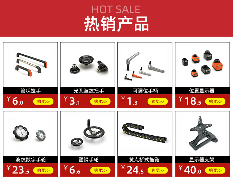 佛山市顺德区欧拓机械有限公司8年专注机械配件研发定制,是一家专注于机械通用配件的研发、生产、销售一体的企业。主要产品有:可调手柄、把手、手轮、拉手、合页 、拖链、调节旋钮、数字表、位置显示器等。产品主要适用于木工机械、印刷机械、包装机械、食品机械、玻璃机械、自动化设备、激光焊接设备、办公器材、医疗器械等,是各行各业机械的通用配件。我们有着十六年丰富的生产及销售经验。这些年来不断开发新的工艺, 引进新的技术,使我们的产品在国内外同行业中脱颖而出,成为国内市场具有竞争力的有名企业。我们坐落于广东佛山顺德,毗邻木工机械重镇伦教,多条高速路直达,交通便捷,物流方便。厂房及办公面积约6000平方米,员工人数达150人,其中技术研发人员约10人。