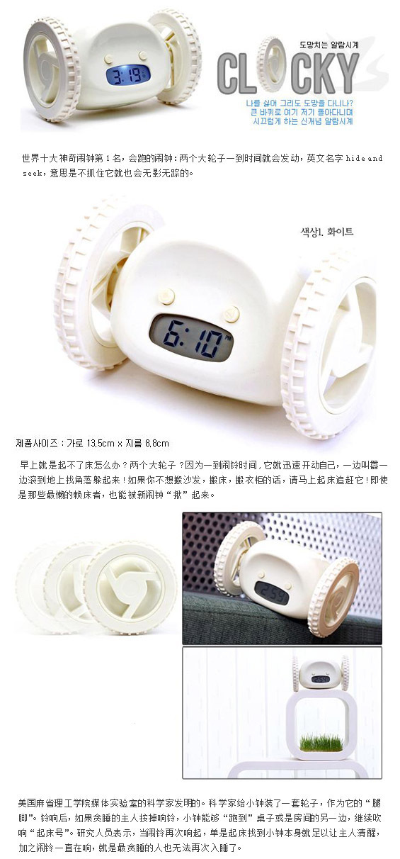 产品介绍:想让我闭嘴,那就立刻起床!”每天清晨,Clocky驾着无敌“风火轮”,哼着简单的音乐,满世界疯跑,如果你是个喜欢赖床的家伙,Clocky可就是你的大敌,想要它闭嘴,你就得立即起床,在它还没消失在某个旮旯之前逮住它,嘿嘿,瞌睡虫们,准备爬起来满世界找你的Clocky吧!