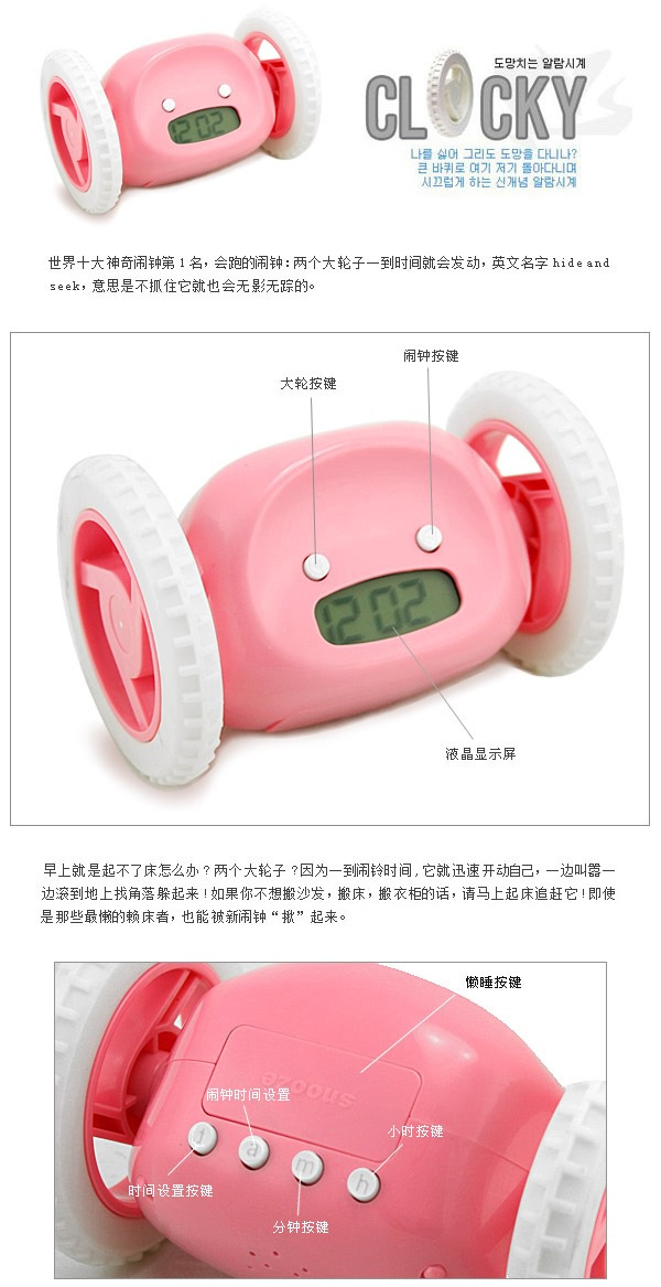 描述: 太可爱了,这个小精灵会跑会闹,想睡懒觉的您不得不起床将它制服,不然您是睡不了好觉的,当小精灵在您屋里的任意角落乱窜时,您把它找出来后,您的睡意已经全无了,您就不会上班或者约会迟到了,哈哈~~小精灵的外观线条柔和,小按键与显示器咋一看就像一个人的脸形,还笑着呢!它就像您的一只小爱宠,原则性很强的哦!不会让您做任何事误了时间,您会爱不释手哦^_^