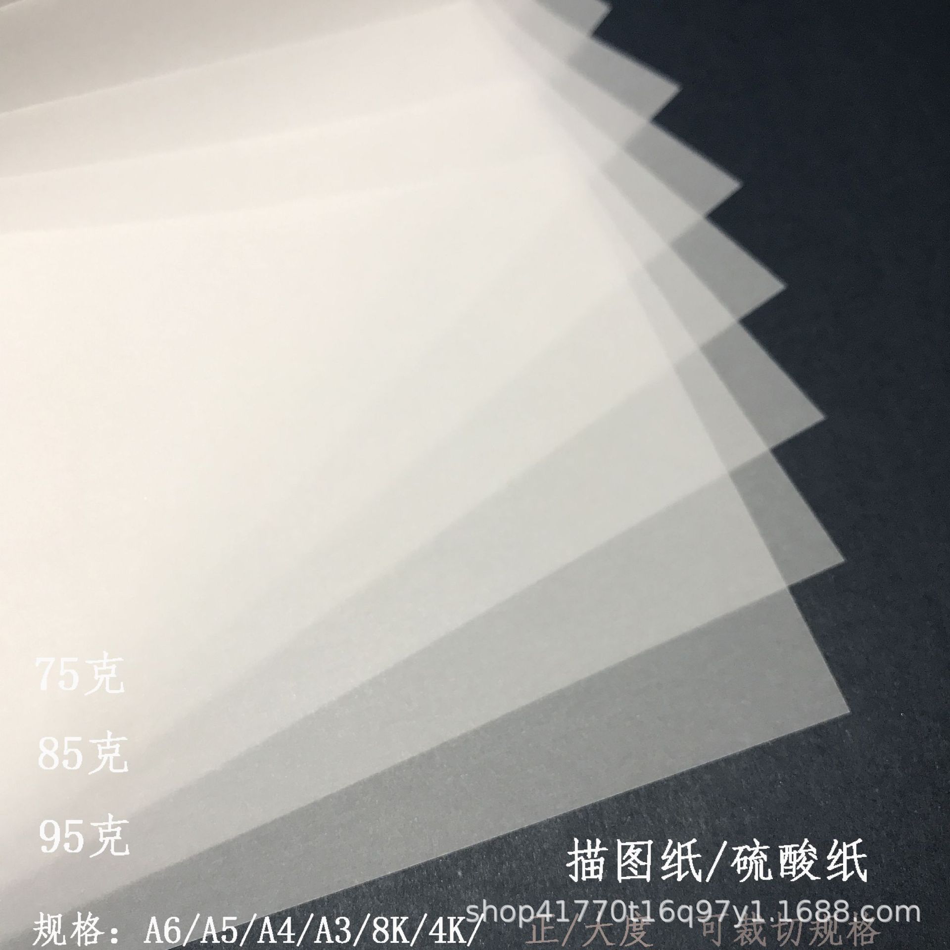 硫酸纸、描图纸,白色,半透明, 787*1092mm、889*1194mm,A4、A3、A2、A1。用于书本、贺卡、相册、图册、广告、吊牌、描图等。
