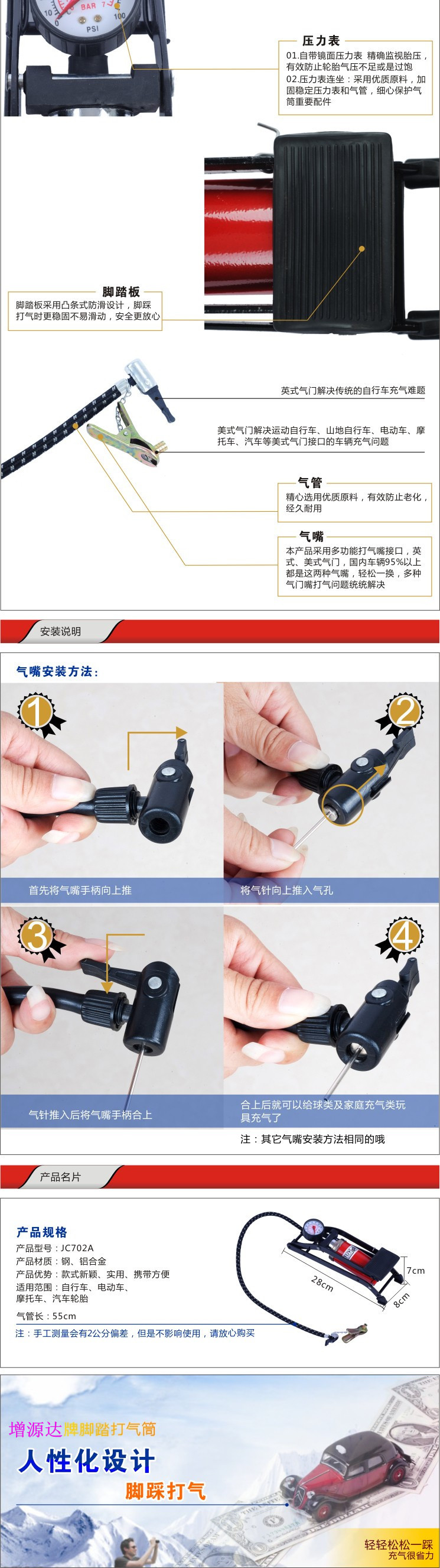 它带有气压表,无须当心车胎打破,可折叠收藏,家居、旅游时使用都十分方便,有了它,您就可以轻松地给汽车、摩托车、自行车、山地车、皮球和各种充气玩具充气了,感觉真的不一样,本产品金属制造,耐用、迷你型、外形小巧,配备多种气嘴