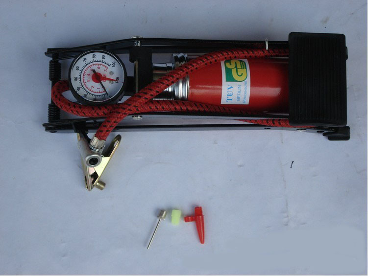 使用说明: 1.先打开上下架子的小勾,然后放在平地上.把气带的钳子钳在车的气嘴. 2.然后脚踏在脚踏板中间上,上下脚踏. 3.第一次充气先手试一下是否充足了,如充足了,看压力表指针位置,以后就按此压力指针的位置充气. 4.经常在气盖小孔内注入2-3滴机油,使活塞延长寿命!
