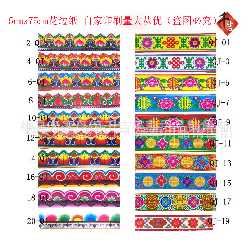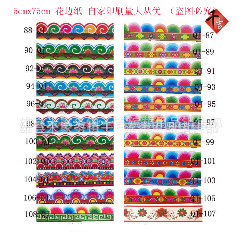 我厂生产印刷的 花边纸,门窗纸、砖瓦纸、及各种花纸、颜色鲜艳,质量可靠,做工精致,欢迎新老客户选购,同样的产品我们比价格,同样的价格我们比质量,是我们千吉人的宗旨!欢迎洽谈选购,