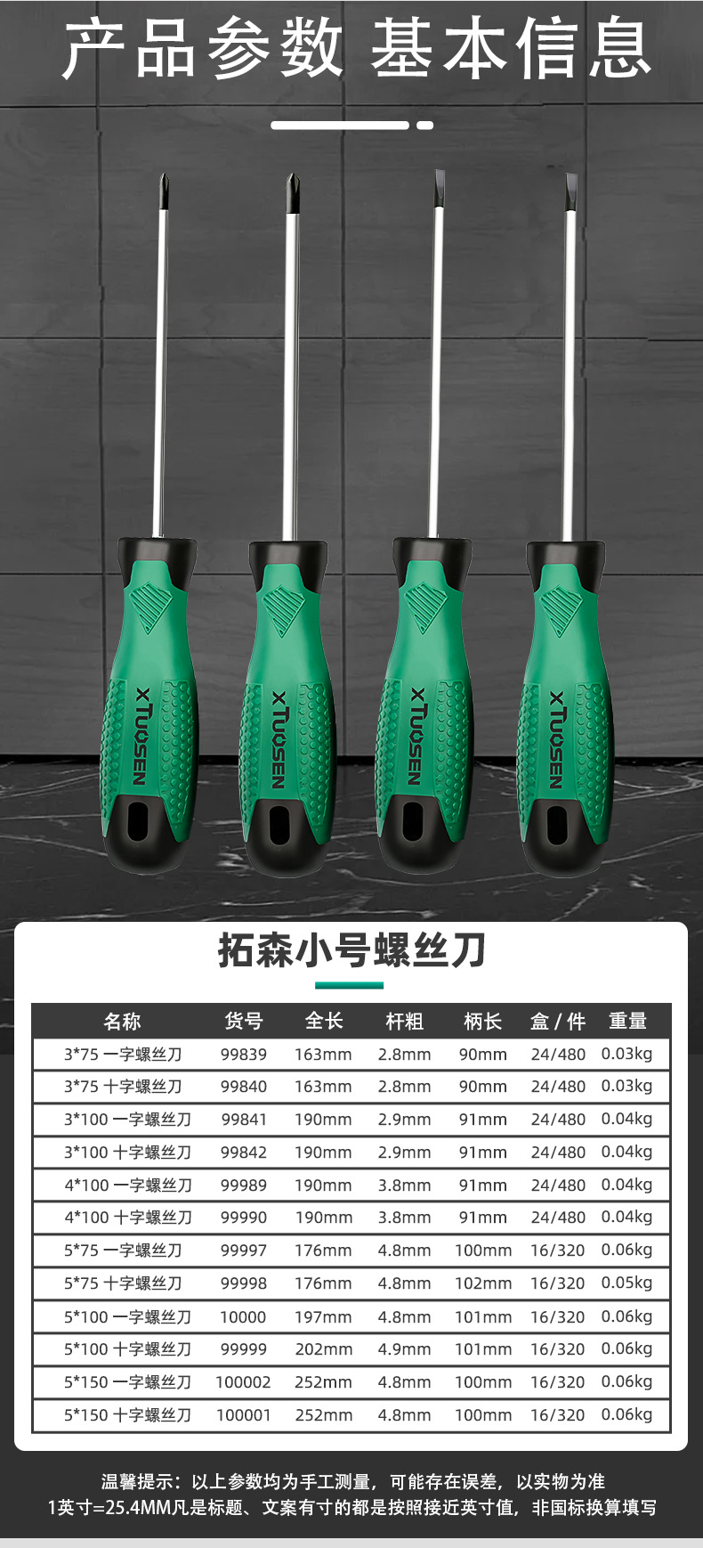 規格型番 99839,3*75一字/一箱24、一枚480/0.03kg,99840,3*75十字/1箱24枚480/0.03kg,99841,3*100文字/1箱24、1枚480/0.04kg,99842,3*100クロス/1ケース24 1枚480,04kg,99989、4*100マイナスドライバー1箱24枚480、04kg,99990、4*100十字/1箱24枚480/0.04kg,99997、5*75一字/一箱16枚320/0.05kg,99998,5*75十字/1箱16枚320/0.06kg,10000、5*100文字/1箱16枚320/0.06kg,99999,5*100クロス/1箱16枚320/0.06kg,100001,5*150クロス/1箱16枚320/0.06kg,100002,5*150一字/一箱16枚320/0.06kg