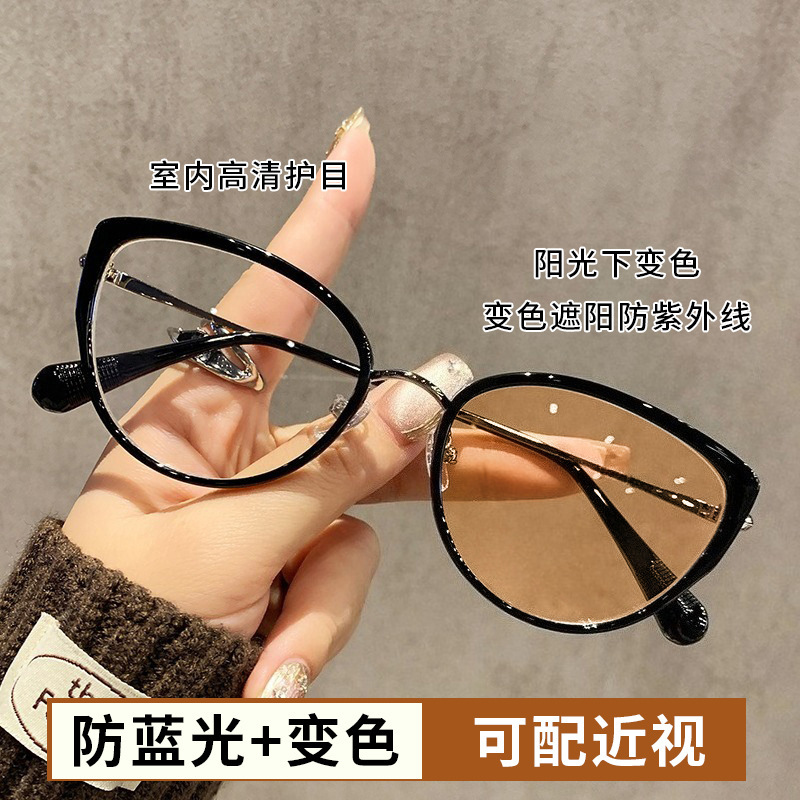 新款变色近视眼镜爆款时尚街拍美式猫眼欧美防蓝光渐变色平光镜架
