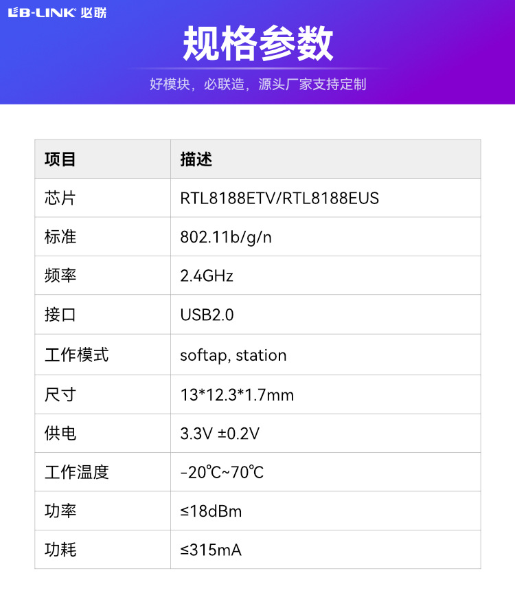 此款模块使用Realtek8188etv方案,USB接口协议,3.3V供电,2.4G频率,单天线,150Mbps传输速率,wifi无线模块适用于平板电脑,笔记本电脑,阅读器等;网络摄像机,机顶盒等;适用于智能电视机,高清4K电视,智能影院投屏设备,适用于车载导航,车机电子产品;消费电子设备或智能家电(蓝光播放器、OTT、机顶盒、IPTV等). 联系人:肖永祥 :13428910291 wifi4 wifi5 wifi6 wifi7模组生产商