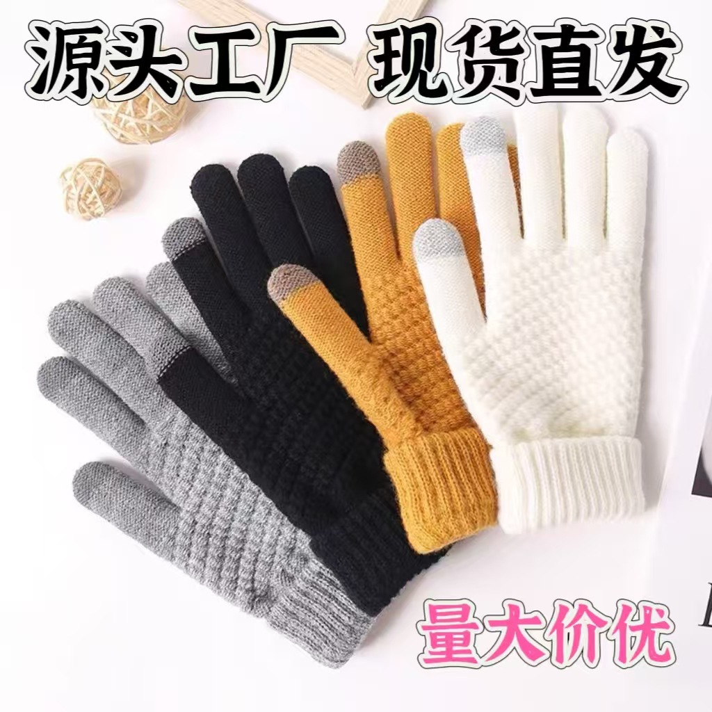 厂家批发菠萝纹触屏手套冬季加绒加厚防风防寒针织毛线分指手套