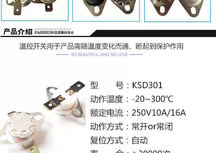 KSD301系列温控器产品是一种用双金属片作为感温组件的温控器,电器正常工作时,双金属片处于自由状态,触点处于闭合/断开状态,当温度达到动作温度时,双金属片受热产生内应力而迅速动作,打开/闭合触点,切断/接通电路,从而起到控温作用。当电器冷却到复位温度时,触点自动闭合/打开,恢复正常工作状态。