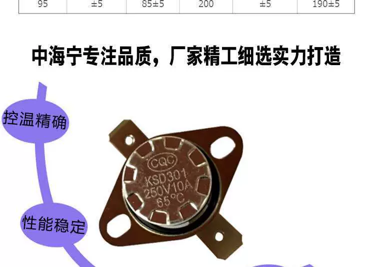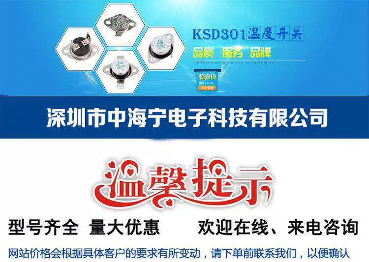 深圳市中海宁电子科技有限公司温控开关生产厂家是一家专业温控开关,热保护器,过流保护器,过载保护器,温度开关,温控器,ksd301温控器,ksd301温控开关,ksd301温度开关,KSD9700温控开关等产品,广泛应用于各种家用电器,马达,灯具,镇流器,电动工具,仪器设备的温控器厂家.全心营造“以质量求生存、以信誉求发展、以规模求效益”的经营理念。我们不断创造质优价廉的温控开关,热保护器,过流保护器,温度开关,温控器,温度保险丝,积极引进吸收国外先进的工艺技术,产品先后通过安规认证,为国内外众多客户配套采用, 广泛应用于众多的家用电器中。