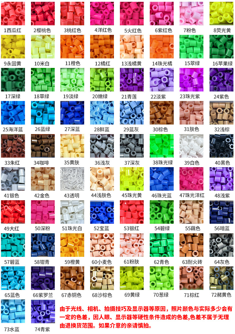 特别注意:随机混色是至少有50多种颜色随机混在一袋里面,颜色会有重复不均匀!!千万不要拍错选项,要单色就拍单色,要混色就拍混色,不然拍成混色忘记备注拼豆颜色发错货导致的损失,请自行负责!!!