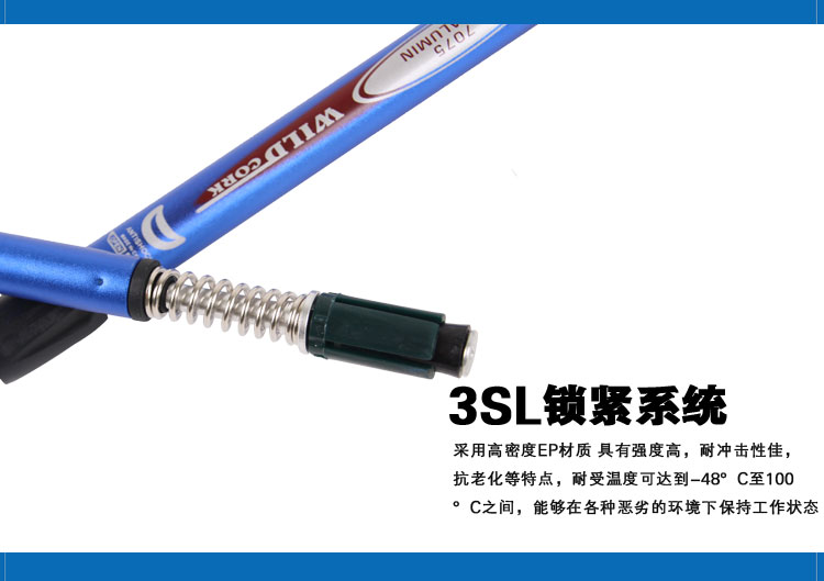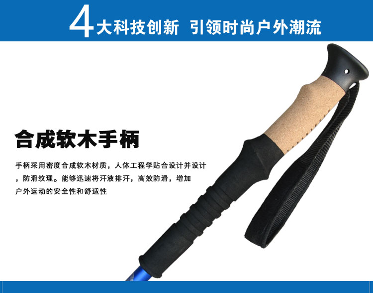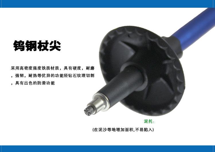 3.防滑手柄的手感,配有防雪盖。杖尖直径小,能很方便的插入在泥土沙子中