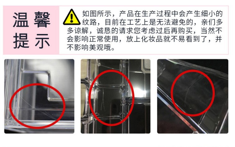 此宝贝为注塑产品,生产过程中,宝贝在不同的部位可能会有一些细如发丝的细纹,这不是质量问题,也不是次品,所有形状复杂的注塑塑料宝贝都有的,透明的宝贝会比较明显,介意者慎拍。